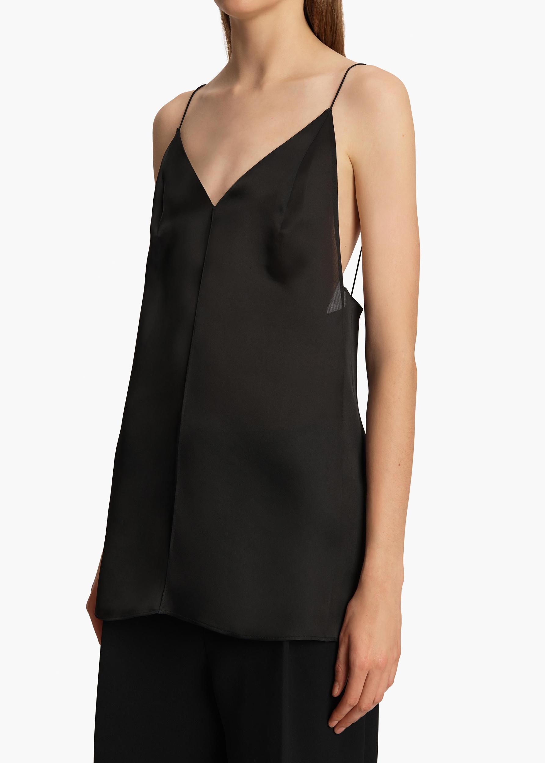 A slip-inspired v-neck top accentuated by the crisp, smooth strength of pure silk organza. Lingerie straps. Central pintuck at front. Side slits. Slips on.