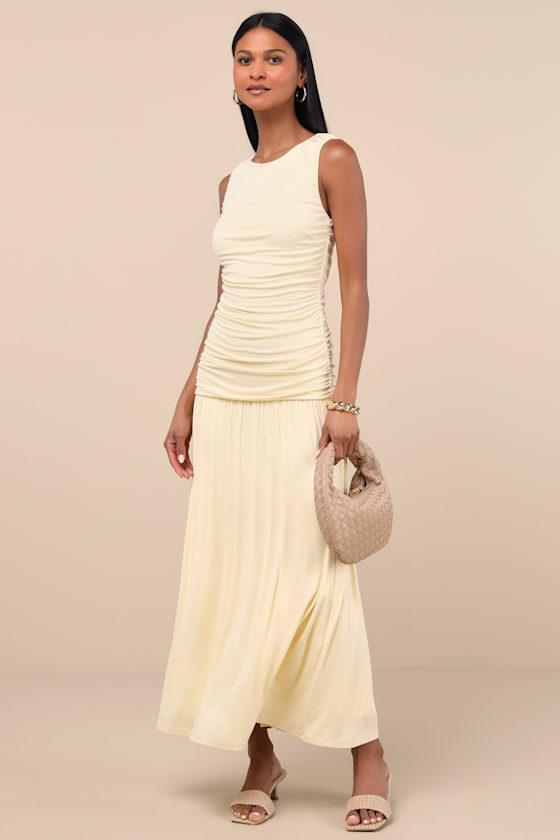 This buttery soft jersey knit dress will do wonders for you figure, thanks to strategic ruching along the sides of the fitted sleeveless silhouette. A trendy drop waist sits atop a breezy A-line skirt that falls to ankle-grazing hem. Button-loop keyhole cutout at back.