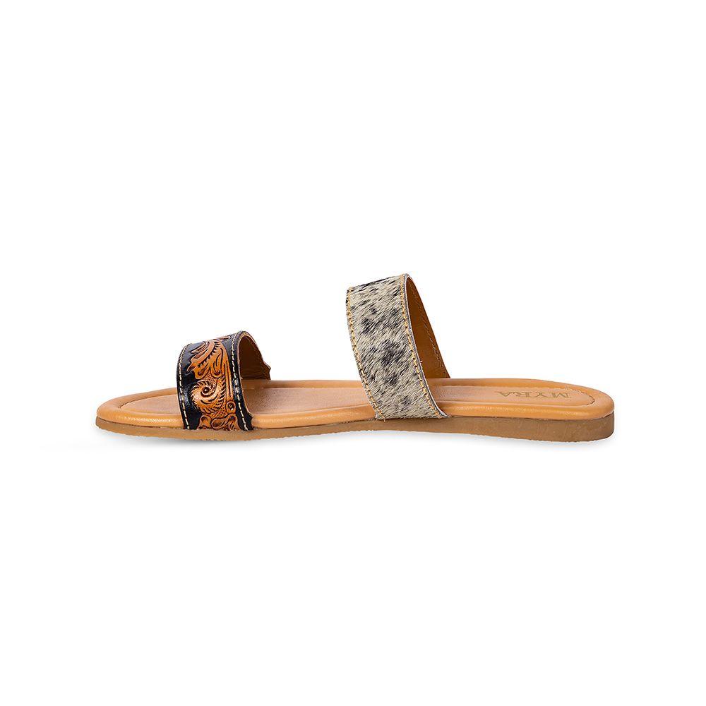 With their great design, you’ll love the style these sandals bring to your wardrobe! One strap is alluring hair-on hide, and the other is lovingly hand-tooled leather with a timeless pattern in warm caramel and ebony. Comfort grip soles assure style and comfort anytime you go out. Genuine cowhide used. Variations in spots and color are natural. Each pair is unique. Embrace the authenticity.