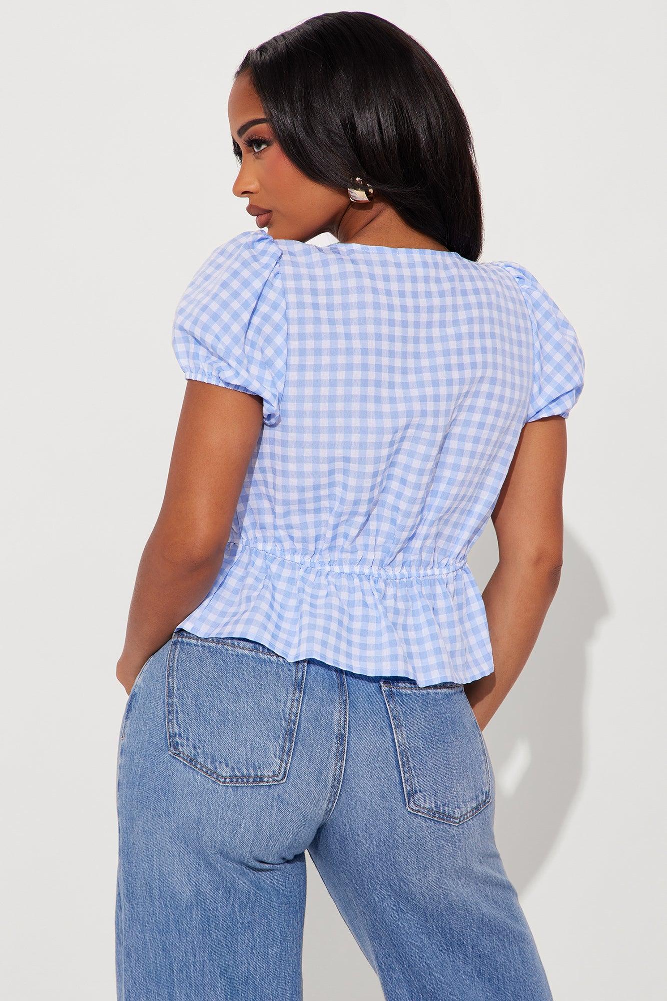 Available In Black/White, Blue And Tan. Gingham Blouse Top Non Stretch Tie Front Bubble Sleeves Self: 50% Polyester 50% Cotton Imported