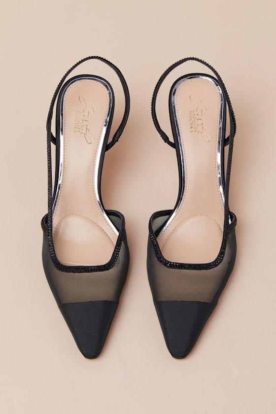 Add a little shine to your look with the Jewel by Badgley Mischka Tammy Black Mesh Rhinestone Slingback Pumps! Sheer mesh knit shapes these ultra-chic pumps with a pointed-toe upper and a solid toe cap. Sparkling black rhinestone studs accent the squared, low-cut collar that flows into a slingback-style strap (with elastic at the instep for fit). A sleek, sculpted heel completes the design!