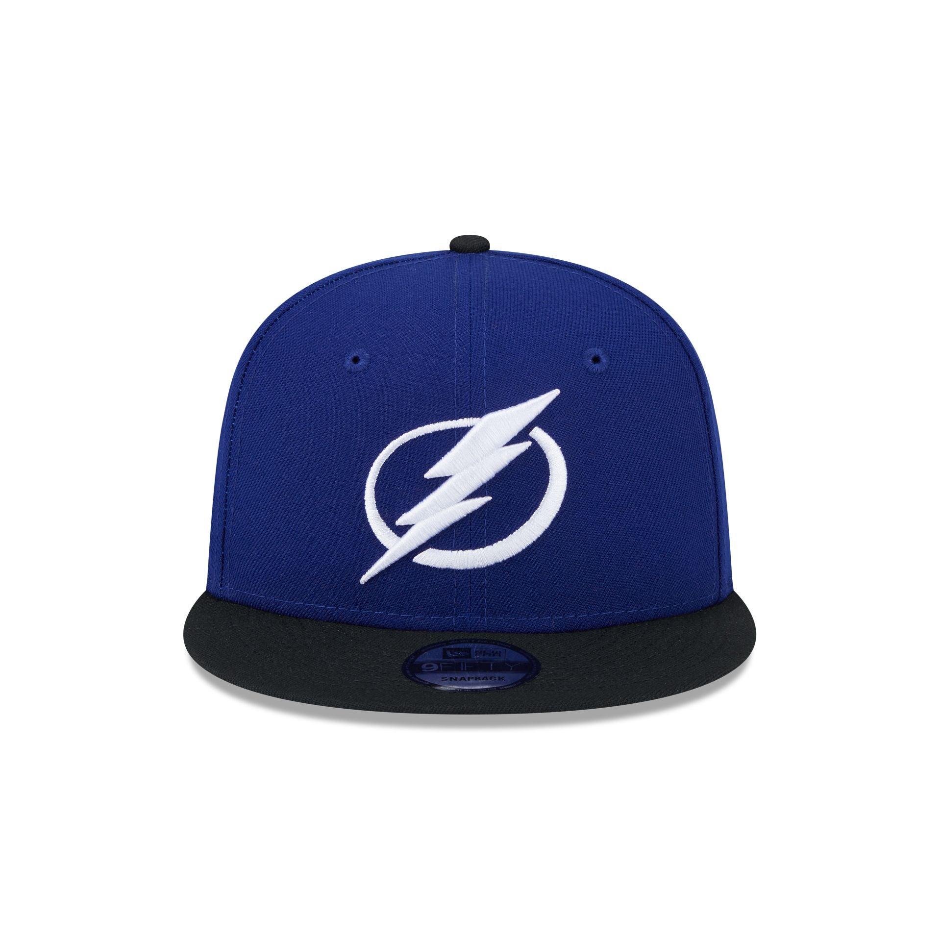 The Tampa Bay Lightning 9FIFTY Snapback features an embroidered Lightning logo at the front panels with a gray undervisor and a snapback closure at the rear.