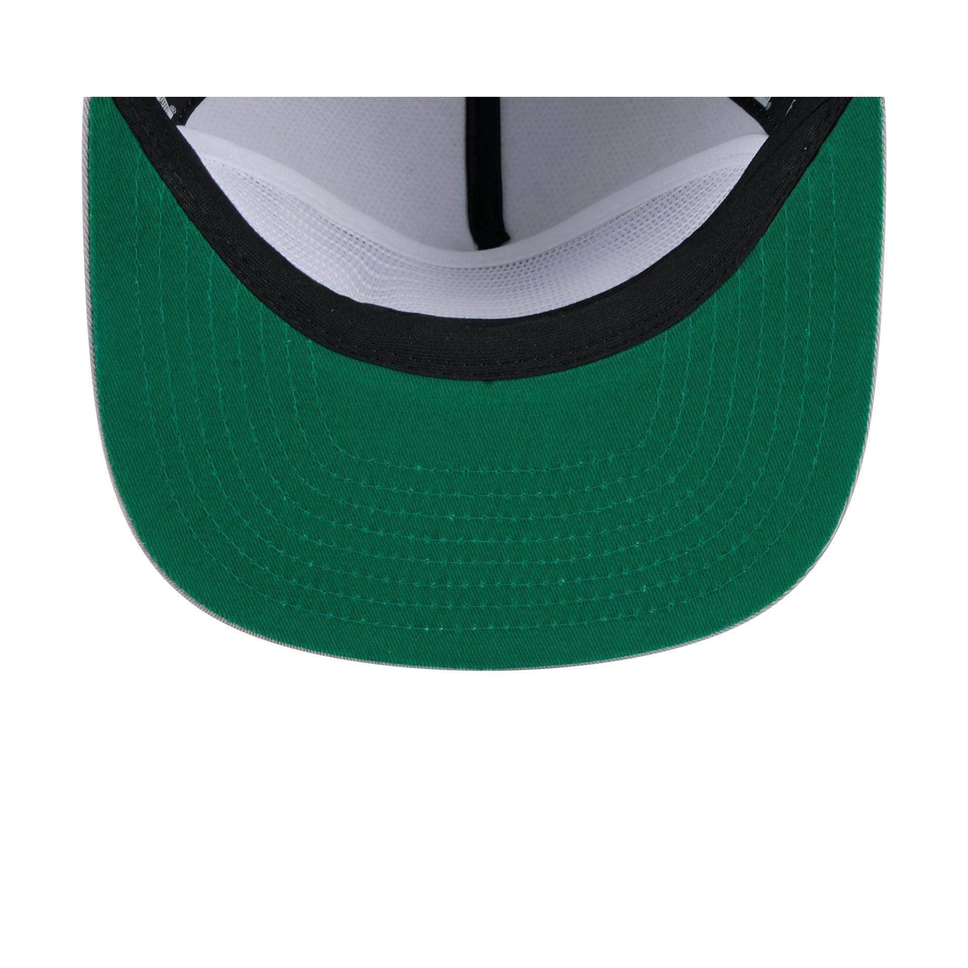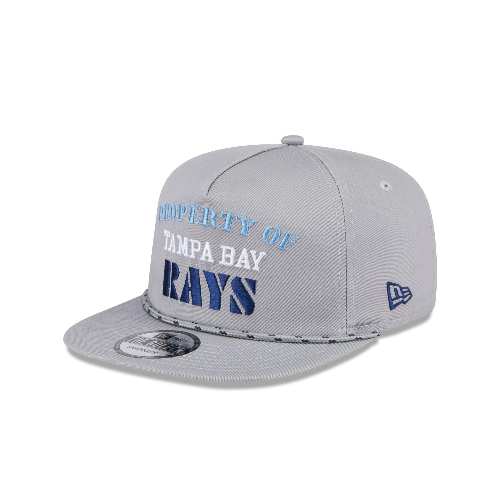 The Tampa Bay Rays Vintage Gray Golfer features an embroidered "PROPERTY OF" Rays wordmark at the front panels with a team logo at the right-wear side and a rope at the visor. Additional details include a snapback closure at the rear and a green undervisor.