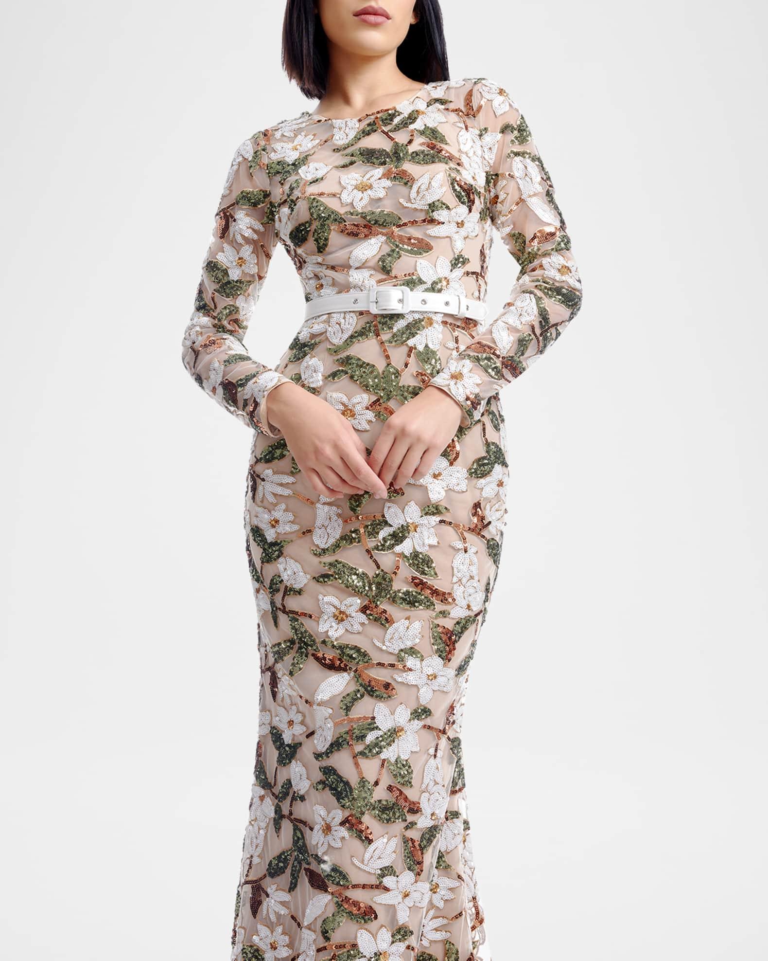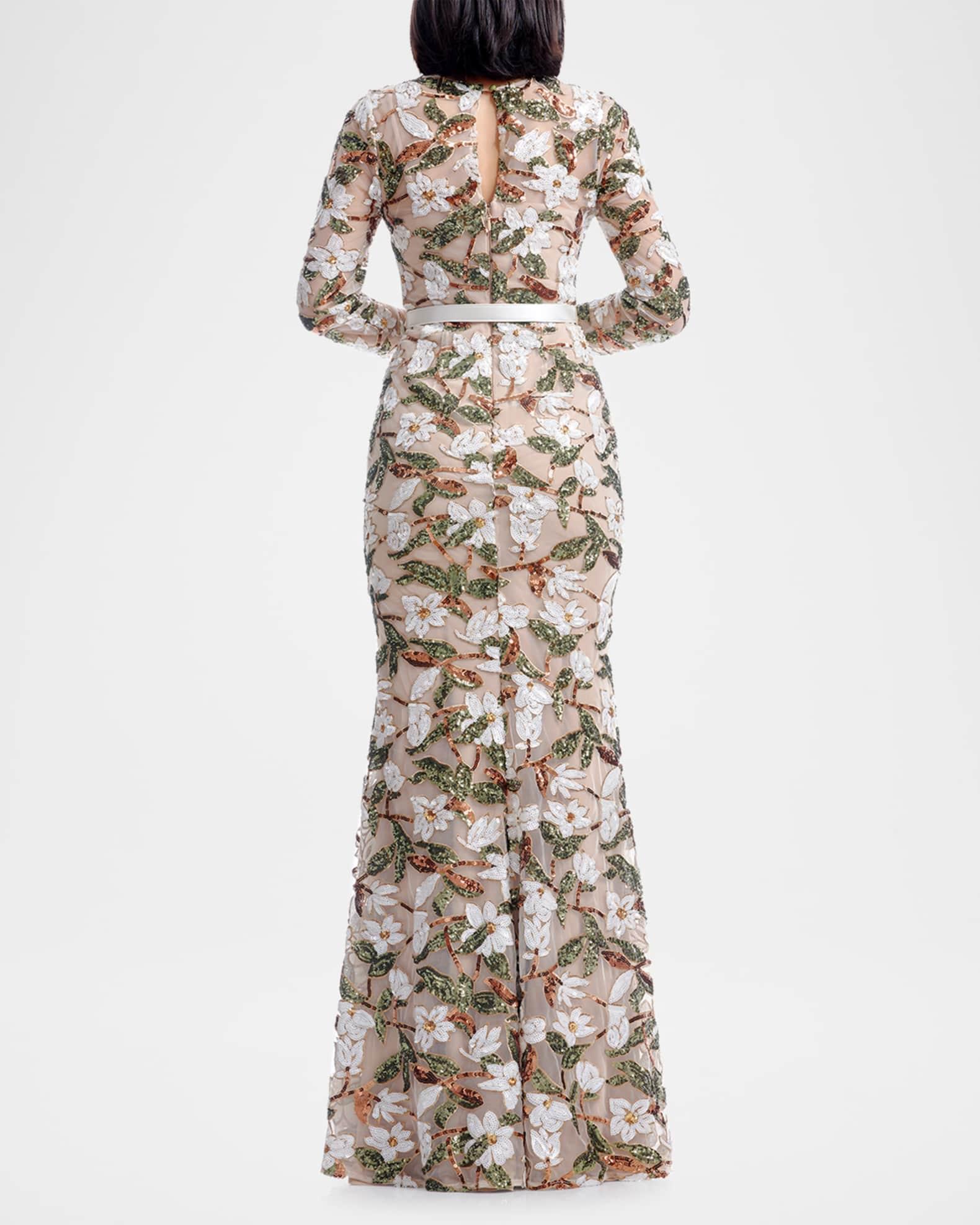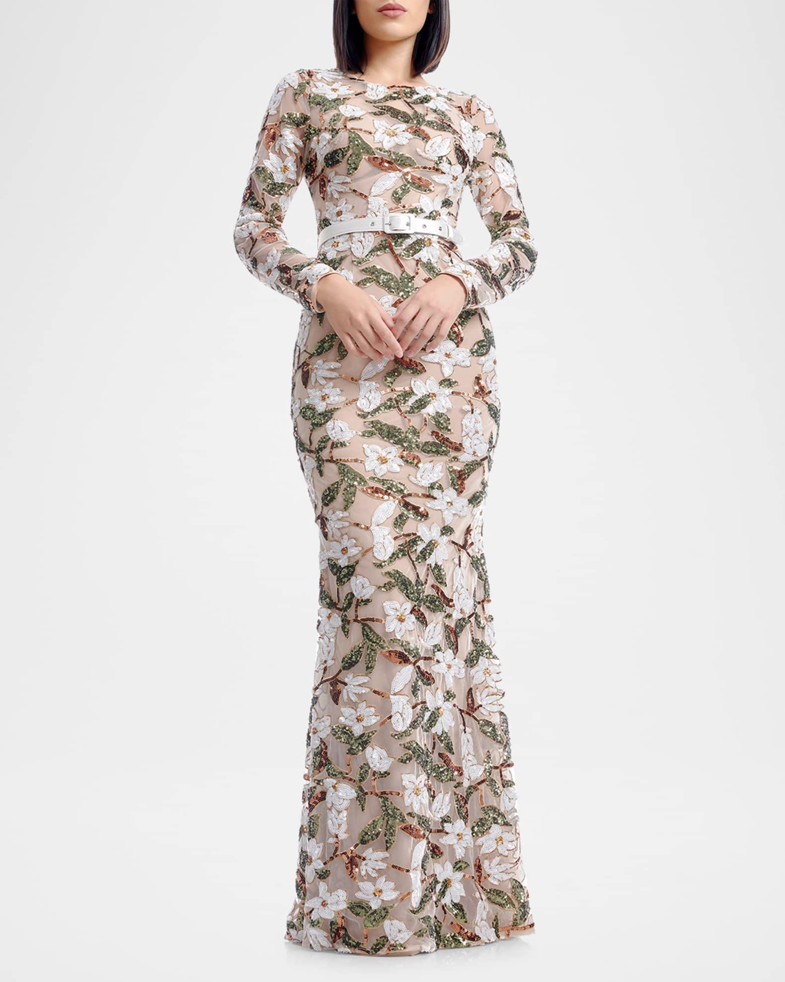 Dress the Population Black Label "Tamra" gown with sequin florals Approx. 60.5"L from shoulders to hem Scoop neckline Long sleeves Belted waist Full length Column silhouette Invisible back zipper Polyester Lining: Polyester Hand wash Imported