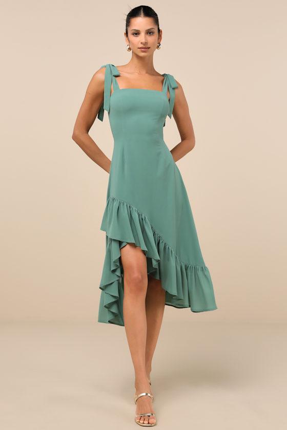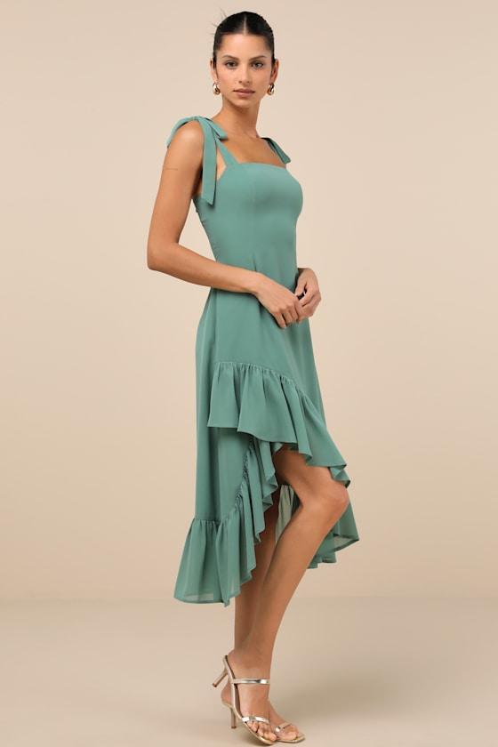 Even if you already have a plus one, the Lulus Tamryn Dark Sage Asymmetrical Ruffled Midi Dress is always perfect company! Airy woven chiffon shapes this chic dress that features long straps that tie at the shoulders and a square neckline. The fit-and-flare silhouette falls to a flowy, A-line skirt with an asymmetrical, ruffle-trimmed midi hem. Hidden side zipper/clasp.
