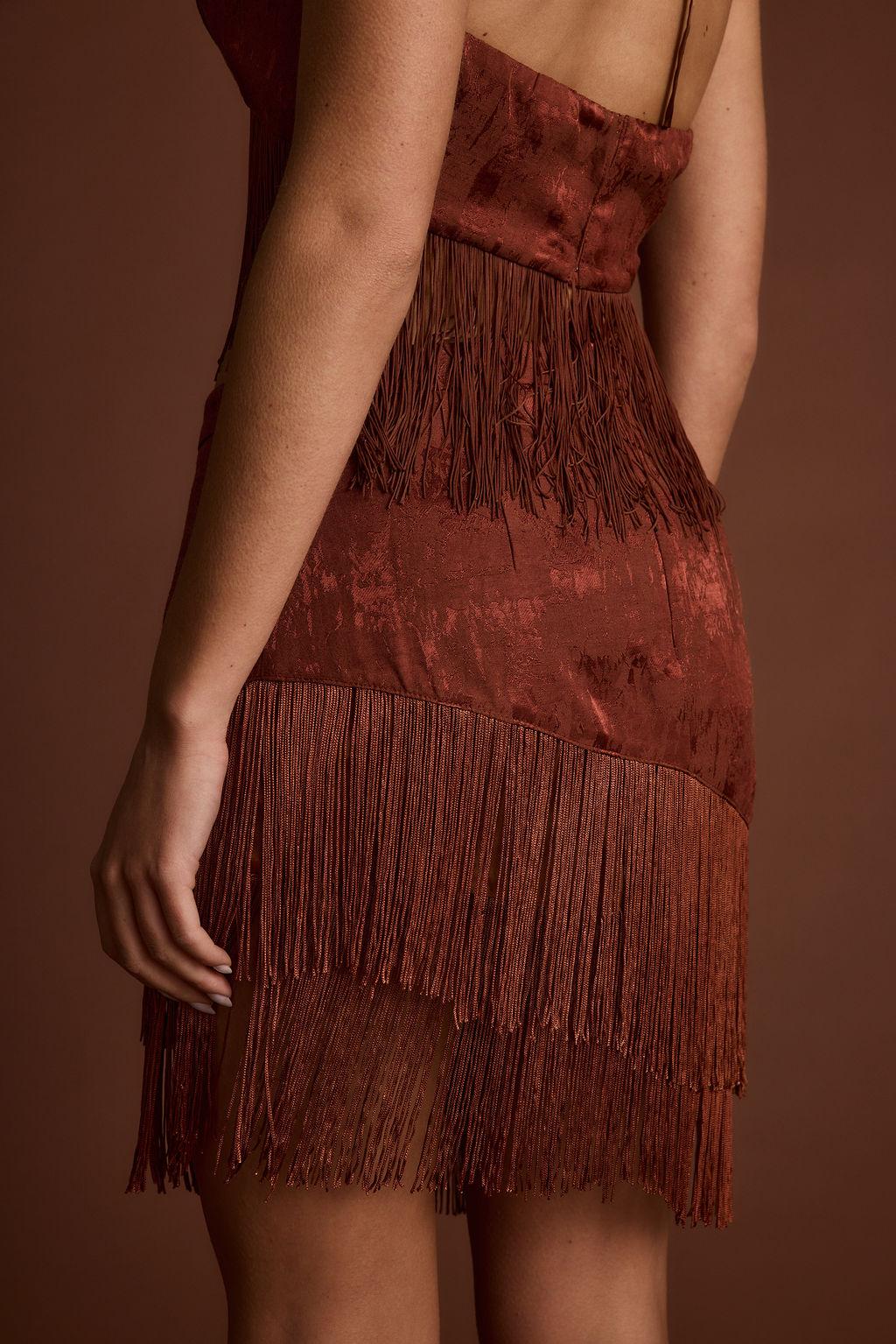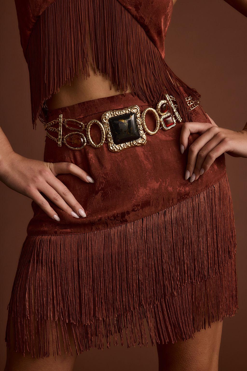 There’s a new cowgirl in town and she’s ready to take center stage. Introducing the statement of the season, the Tamsin Terracotta Jacquard Fringe Set. Made from a luxe satin terracotta red jacquard material with flirty fringe, rebel chic meets western vibes. Perfect for festival days and desert nights, pair it with the matching Tamsin Mini Skirt. for headliner vibes or style it solo for your own take on iconic.