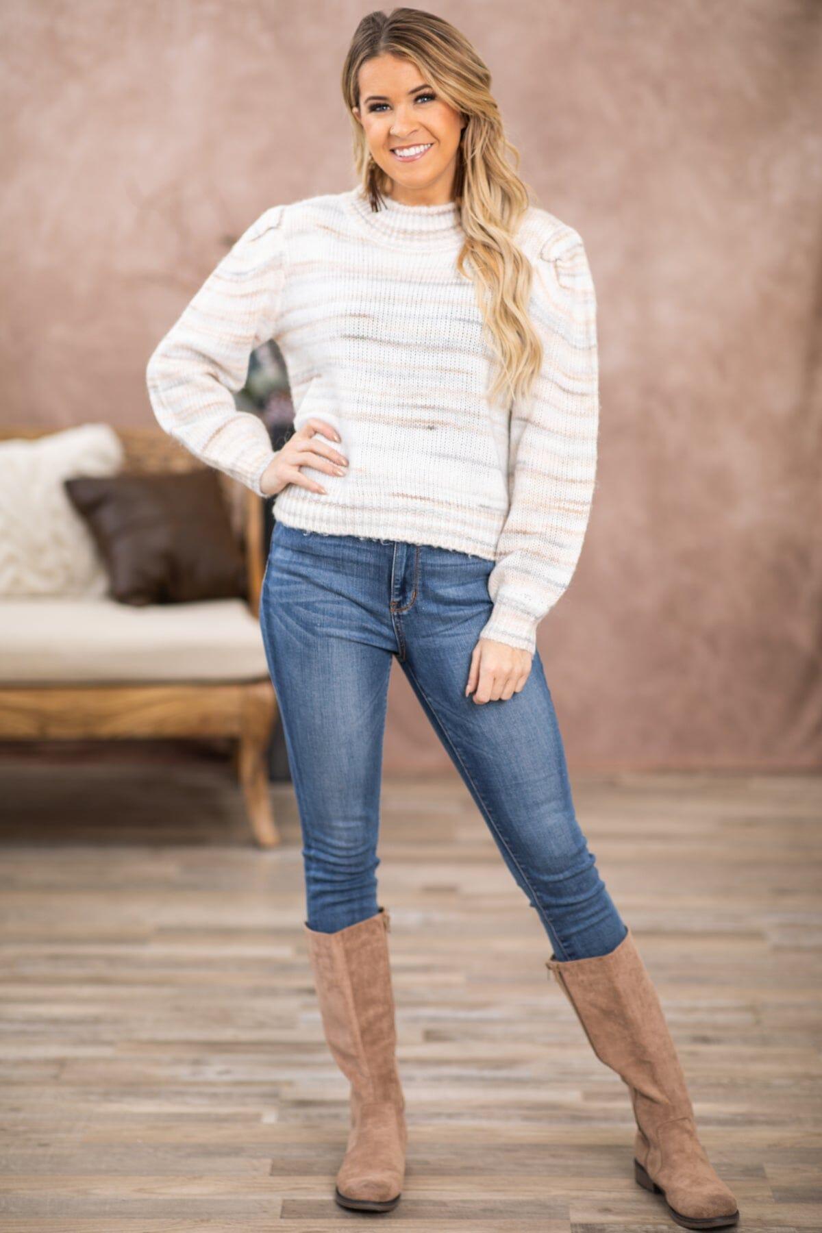 Product Details Colors: Ivory, Grey, Tan Print: Stripes Collar: Round Sleeve: Long Sleeve Hemline: Straight Color Season: Summer Material and Care 52% Polyester 31% Acrylic 10% Nylon 7% Wool Hand Wash Cold Hang/Line Dry Size and Fit Small: Bust 40" Waist 40" Length 23" Medium: Bust 42" Waist 42" Length 23" Large: Bust 44" Waist 44" Length 23" XLarge: Bust 46" Waist 46" Length 23" Model is 5'9 and wearing a size small