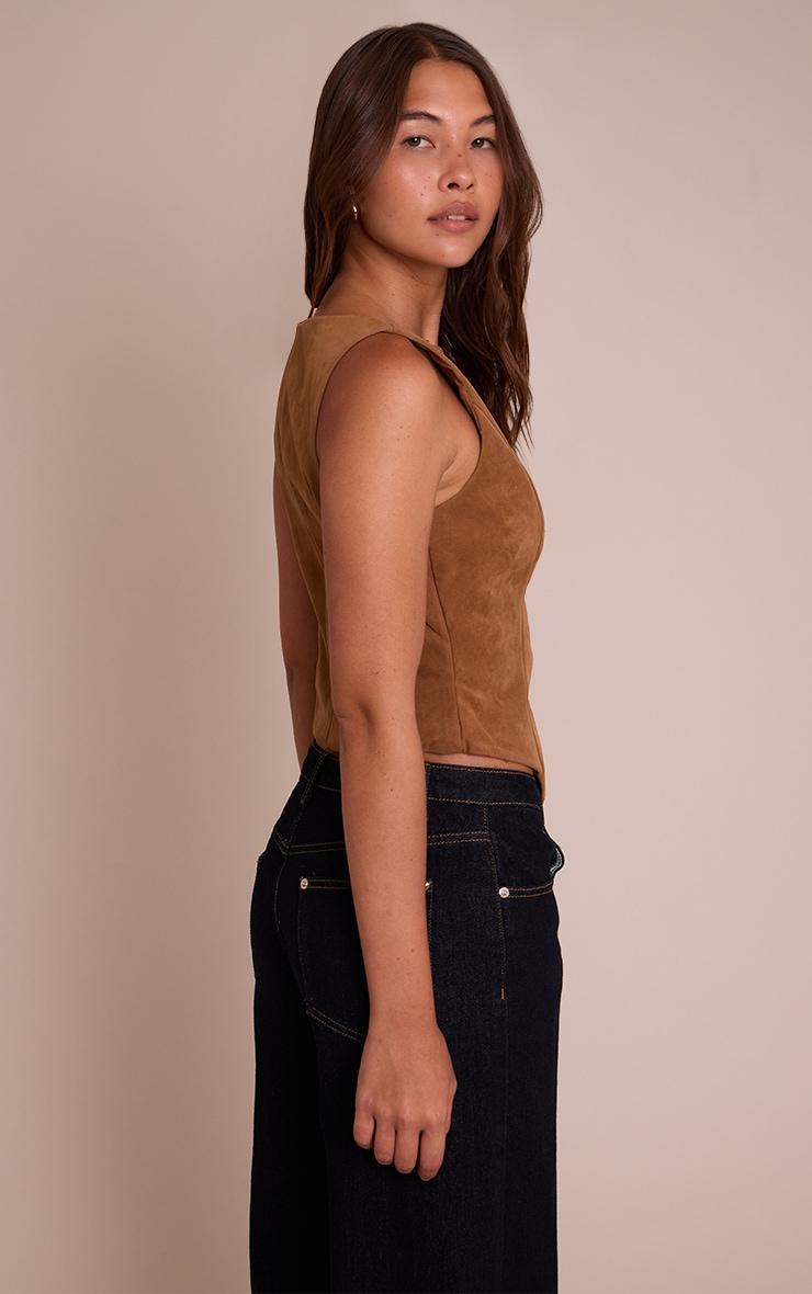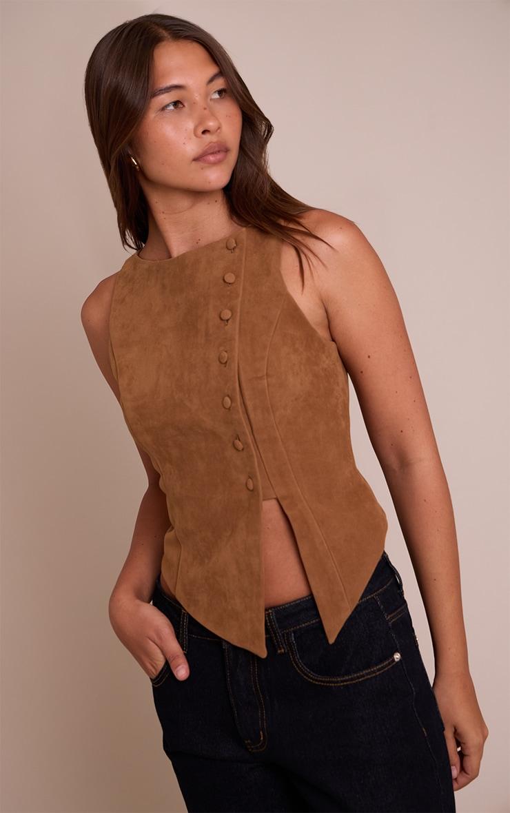 Cultivate an effortlessly polished aesthetic with a piece designed to turn heads. The tan faux suede asymmetric button detail vest is a masterclass in modern tailoring, its structured silhouette featuring a clean round neckline and a sharp, sleeveless cut. Your eye is drawn to the distinctive asymmetric line of buttons that fasten along the front, complemented by an artfully angled hem that lends a confident, contemporary edge. Pair this versatile vest with high-waisted tailored pants for an elevated daytime ensemble, or opt for sleek tailored shorts for an equally sharp statement. Complete your look with chic black mules and subtle gold rings, ensuring every detail reflects your discerning taste.Length approx 48.5cm/19inch (Based on sample size US 4)Model wears size UK 8/ EU 36/ AUS 8/ US 4Model Height - 5ft 10inchp]:!mb-4inch>Brand: PrettyLittleThingCategory: TopsProduct type: WaistcoatColor: TanMaterial: Faux SuedeDesign: PlainNeckline: CrewSleeves: SleevelessOccasion: Day