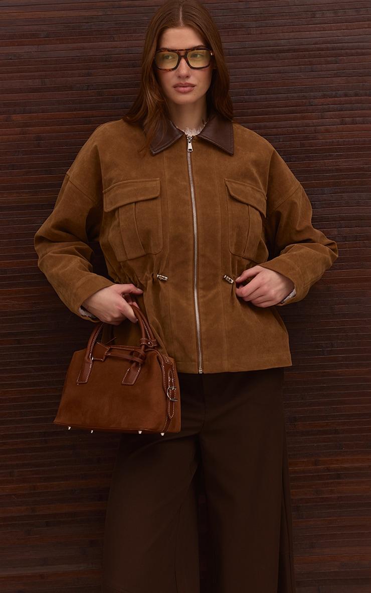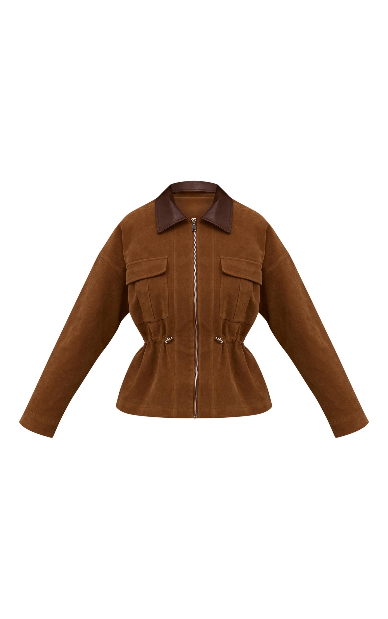 Opt for earthy tones in the tan faux suede contrast collar cinch waist jacket. Crafted from soft tan suede with a contrasting collar detail, this jacket combines structure and comfort for a chic outerwear staple. Pair with jeans and heels for a timeless seasonal style.Length approx 48.5cm/19inch (Based on sample size S)Model wears size SModel Height - 5ft 9inchp]:!mb-4inch>Brand: PrettyLittleThingCategory: OuterwearProduct type: JacketColor: TanMaterial: Faux SuedeOccasion: Evening