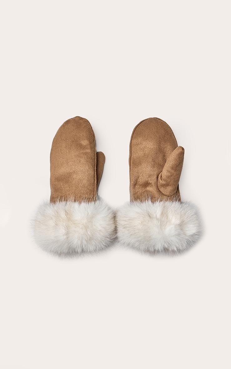 Own your winter edit with a confident touch, courtesy of the tan faux suede fur trim mittens. These essential accessories feature a distinctive faux suede body, elegantly finished with a contrasting white faux fur cuff that adds an artful flourish to your cold-weather ensemble. For a day look that’s undeniably put-together, team these with a chic tailored coat and your favorite pants, grounding the aesthetic with sleek western boots. Complete the vibe with a pair of sharp black sunglasses, ensuring your style statement is both knowing and effortless.p]:!mb-4inch>Category: AccessoriesProduct type: GlovesColor: TanMaterial: Faux SuedeOccasion: Day