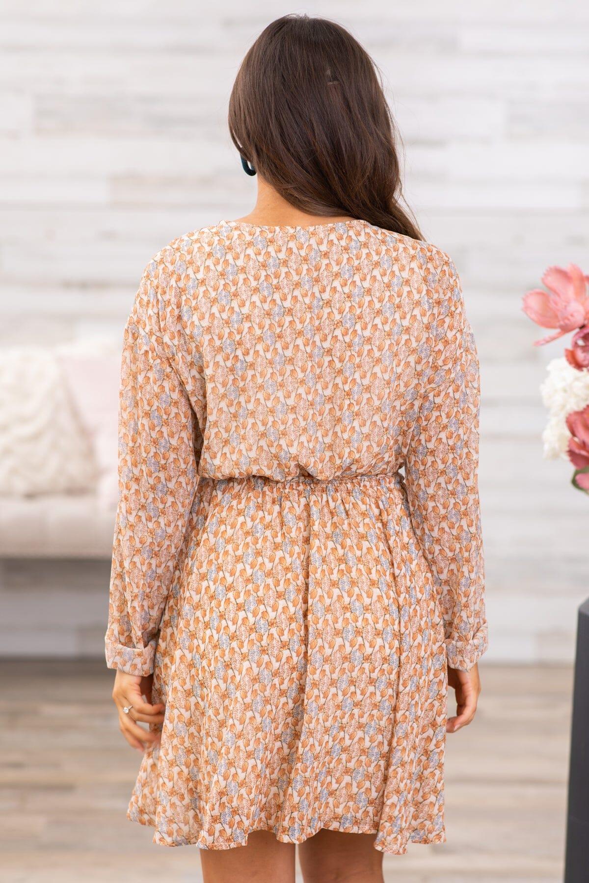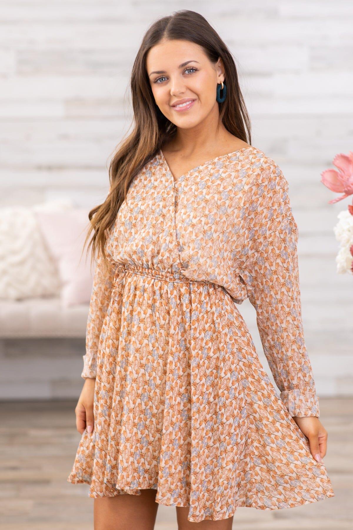 Product Details Colors: Tan, Pastel Blue, Peach, Olive, Off White Print: Floral Collar: Surplice Sleeve: Long Sleeves Hemline: Straight Color Season: Autumn Material and Care Self: 100% Polyester Lining: 100% Polyester Hand Wash Cold Hang Dry Size and Fit Small/Medium: Bust 34" Waist 26/28" Length 34" Medium/Large: Bust 36" Waist 28/30" Length 35" Model is 5'1 and wearing a size small/medium