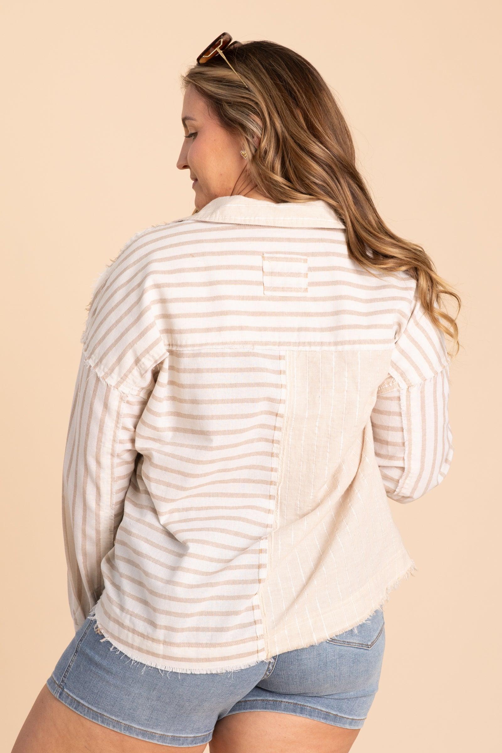 Product Details Colors: Tan, Beige Print: Stripes Neckline: Button Down Sleeve: Long Sleeve Hemline: Round Brand: Umgee Material and Care 55% Cotton 45% Polyester Contrast: 65% Cotton 35% Linen Hand Wash Cold Hang/Line Dry Size and Fit Small: Bust 46" Waist 46" Length 26.5" Medium: Bust 48" Waist 48" Length 27" Large: Bust 50" Waist 50" Length 27.5" Model is 5'8 and is wearing her true size large