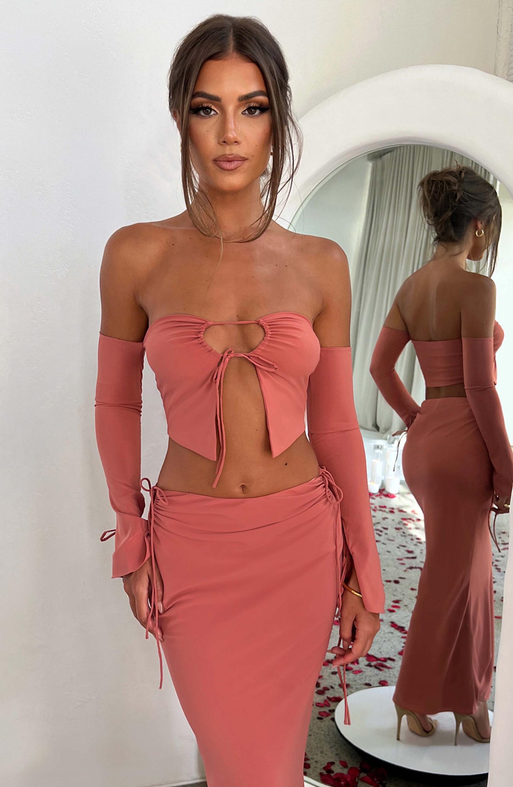 The flowy, gorgeous lines of Tana will make sure all eyes are on you this season. Designed in our lightweight georgette satin with a stunning sheen, the Tana top has off the shoulder styling, long sleeves, cut out and tie detail to the bust. Partner her with the Tana maxi skirt, go out and glow. Colour: Rose Pink. Flowy, non stretch georgette satin. Drapes over figure. Long sleeves with tie detail. Off the shoulder styling. Cut out at bust with a tie. Cropped length.