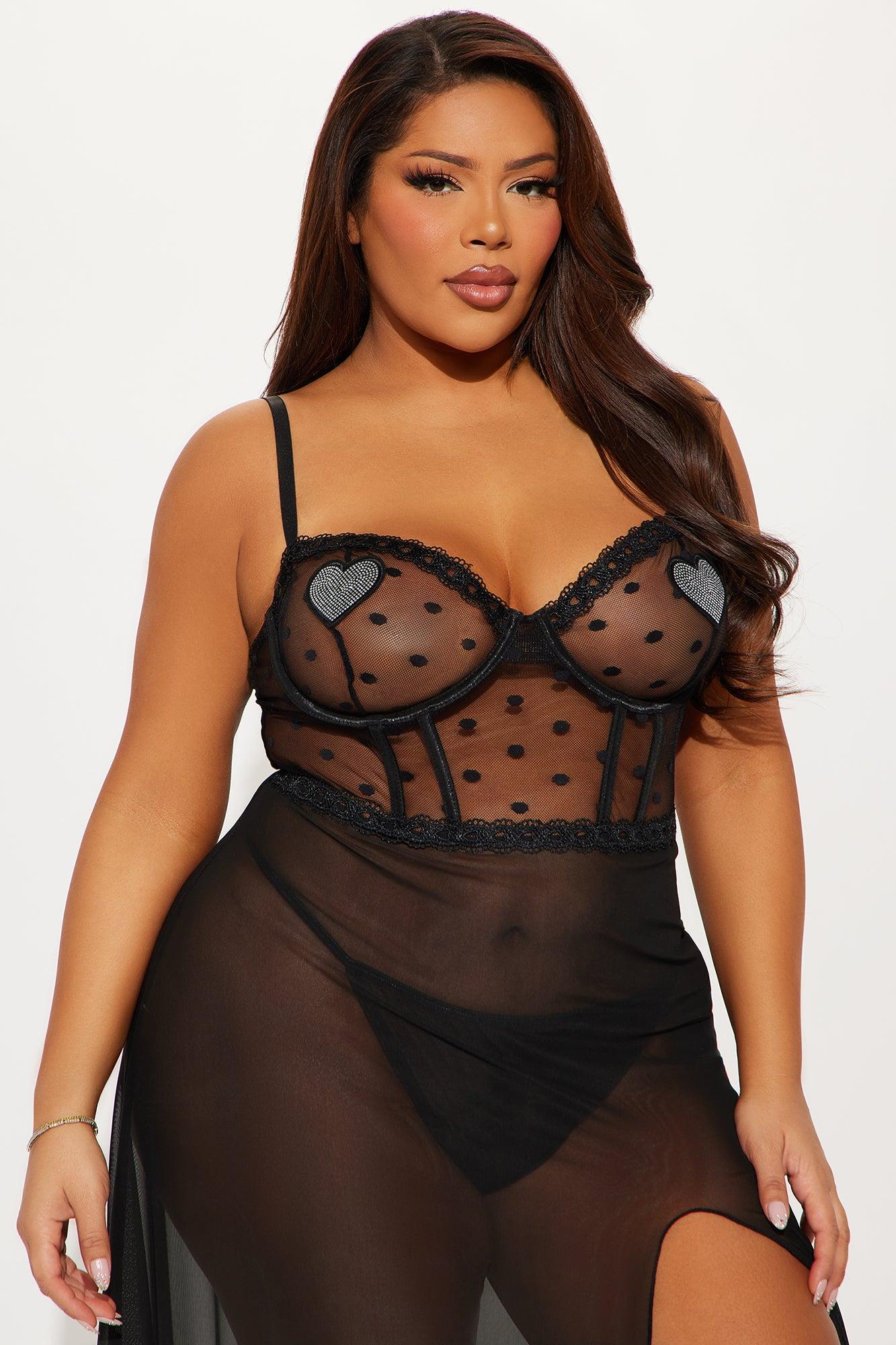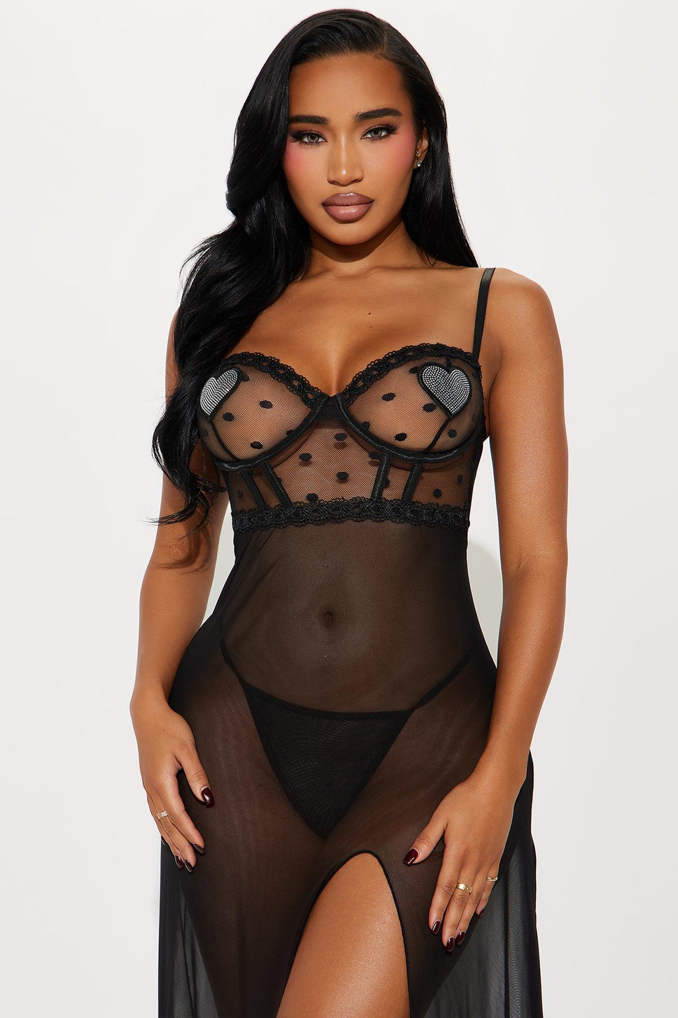 Available In Black. Mesh Babydoll Underwire Top Adjustable Spaghetti Straps Rhinestone Heart Detail Bow Applique High Slit Matching Panty Final Sale 90% Polyester 10% Spandex Imported California Proposition 65WARNING: Cancer and Reproductive Harm - www.P65Warnings.ca.gov.