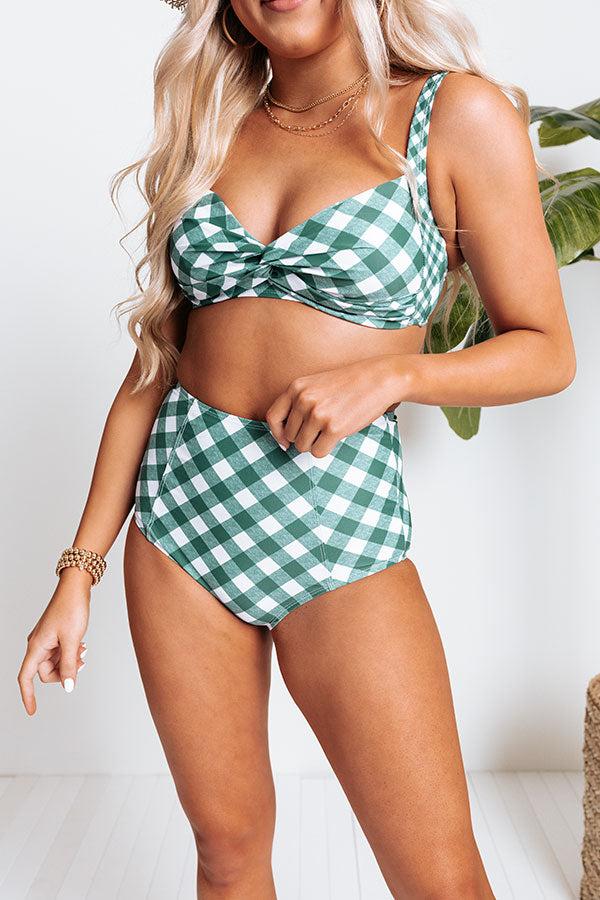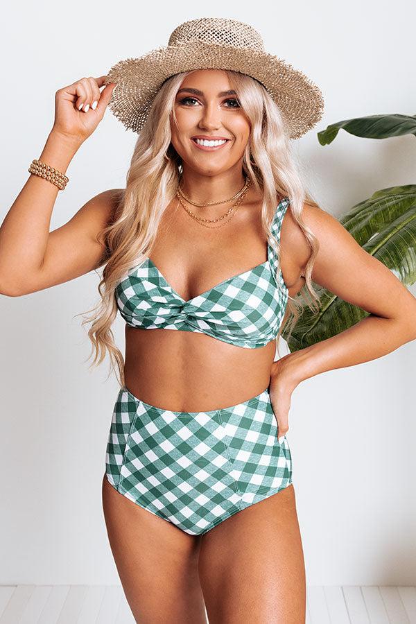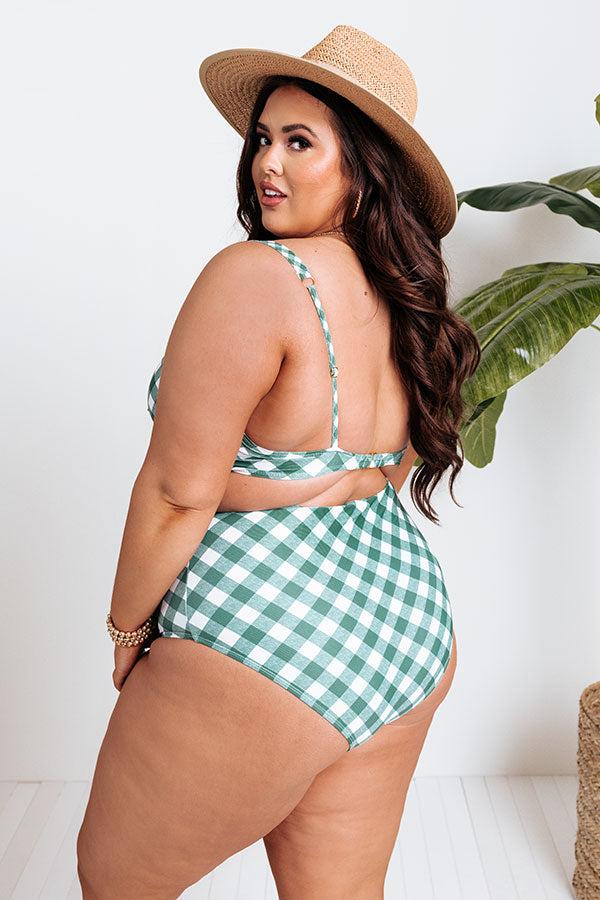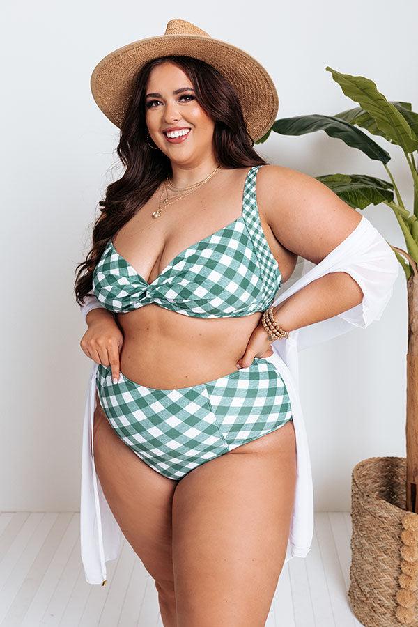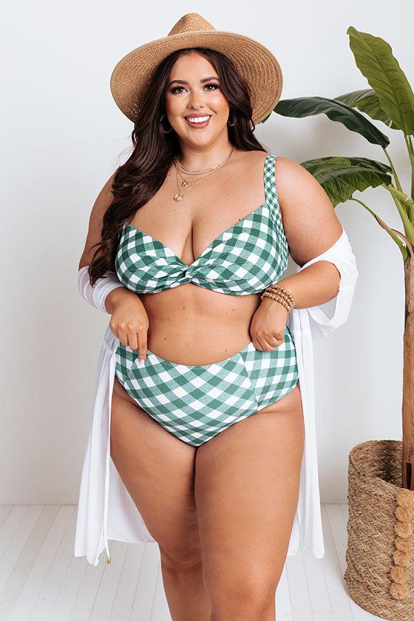Have fun in the sun looking fabulous in our adorable 'Tanning In Tulum' bikini bottoms featuring lightweight four way stretchy material patterned with a white and hunter green gingham print, a high waistline for tummy control, and a flattering form fitting silhouette that ends in a cheeky fit! Measurements S : Hip 32-36", Waist 24-26". M : Hip 34-38", Waist 26-28". L : Hip 36-40", Waist 28-30". XL : Hip 38-42", Waist 30-32". 2XL : Hip 40-44", Waist 32-34".