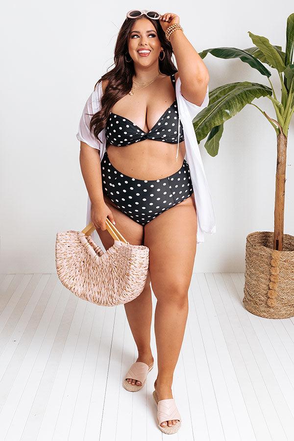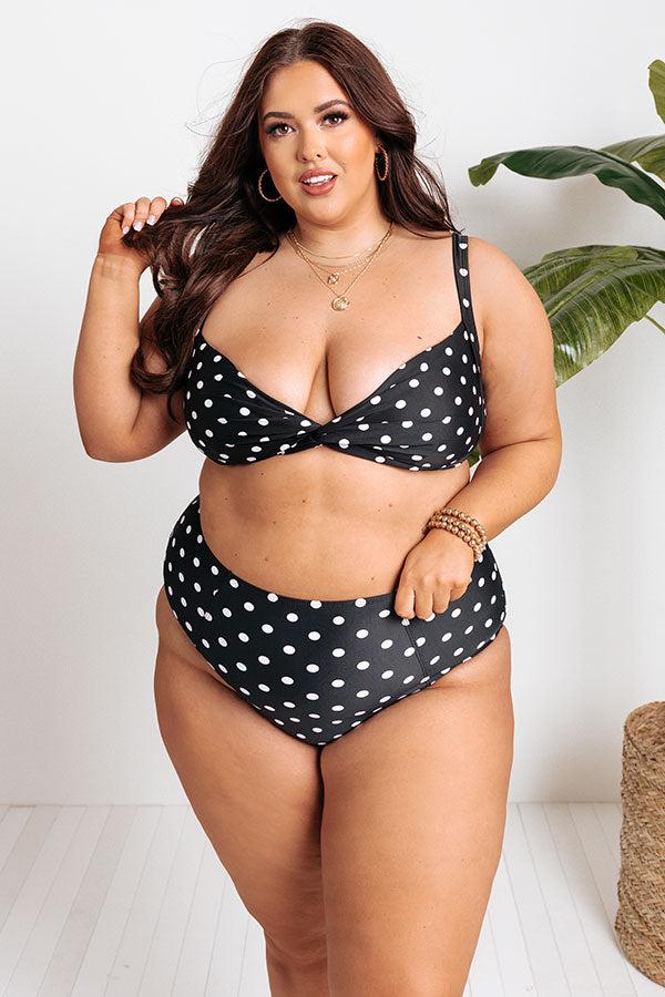 Have fun in the sun looking fabulous in our adorable black 'Tanning In Tulum' bikini top featuring lightweight four way stretchy material patterned with white polka dots, an ultra wide v-cut neckline with adjustable spaghettis traps, a twisted bodice with removable pads, and a straight hemline with a hook closure in the back! Measurements S : Int Cup A-B", Int Width 32-33". M : Int Cup A-B", Int Width 33-34". L : Int Cup C-D", Int Width 34-35". XL : Int Cup C-D", Int Width 35-36". 2XL : Int Cup C-D", Int Width 36-37".