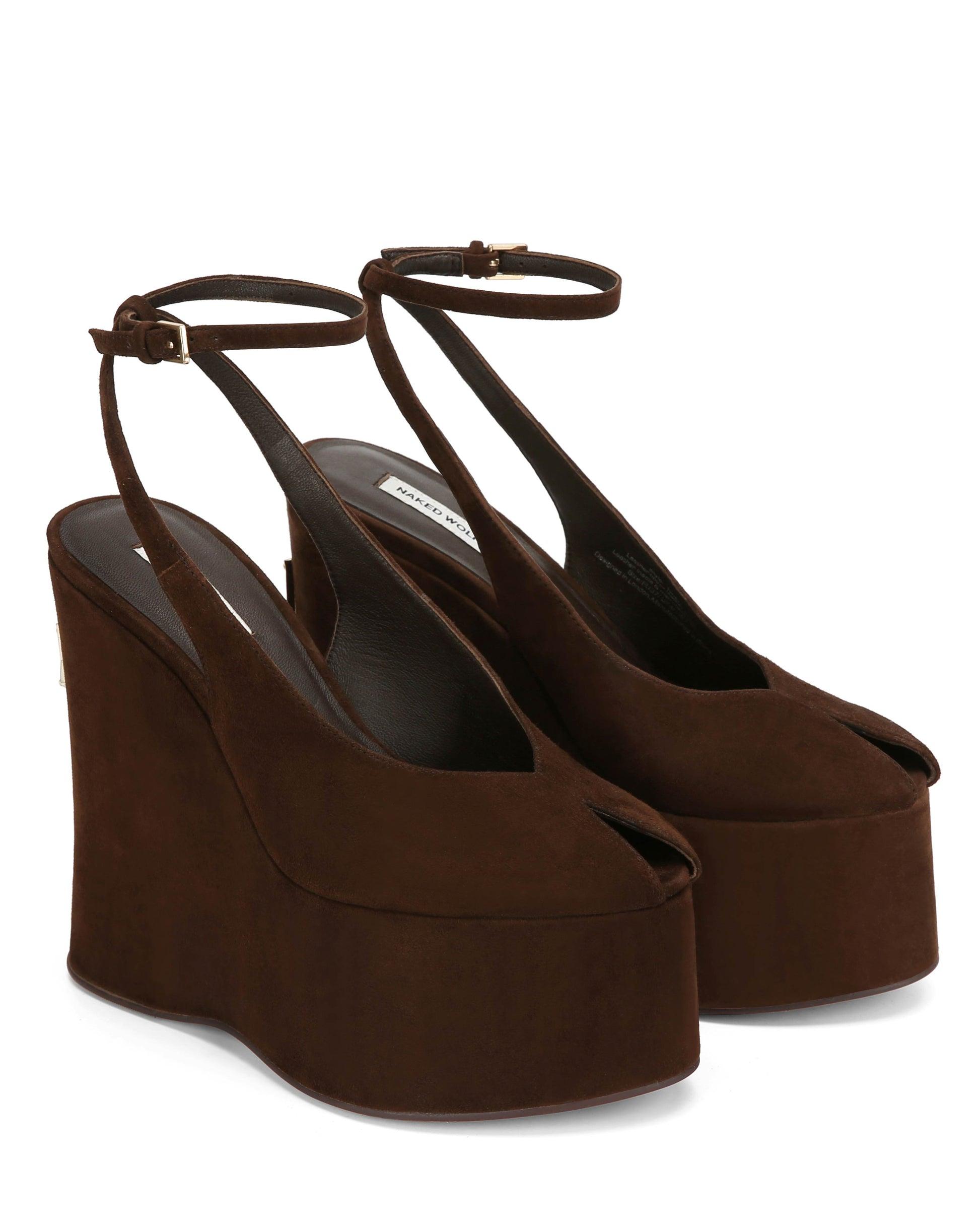 Tansy is our latest wedged heel, showcasing a sophisticated peep toe design. Crafted from premium luxury suede, this heel features a platform elegantly wrapped in matching suede and is finished with the renowned Wolfe head plaque on the heel for a refined statement.