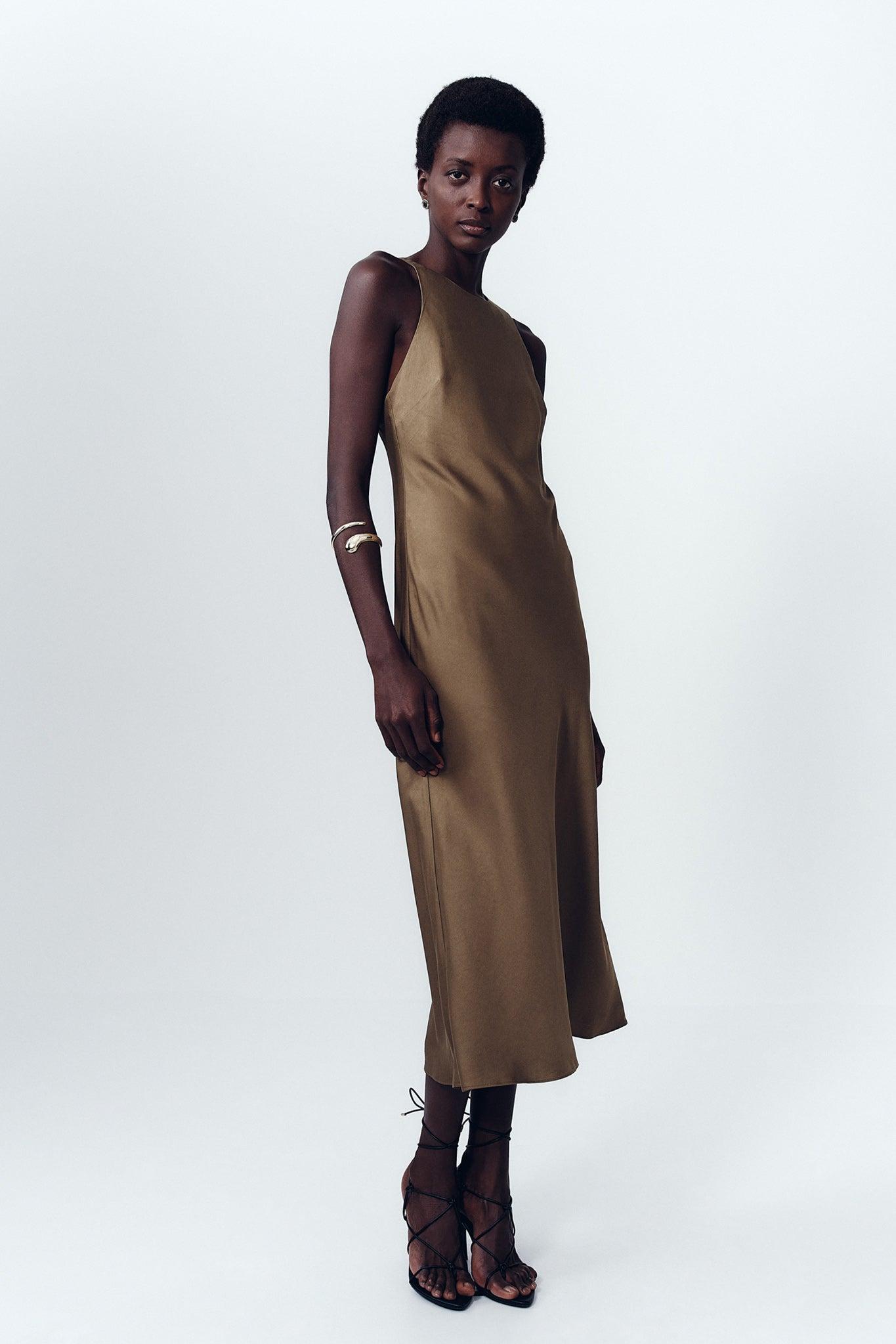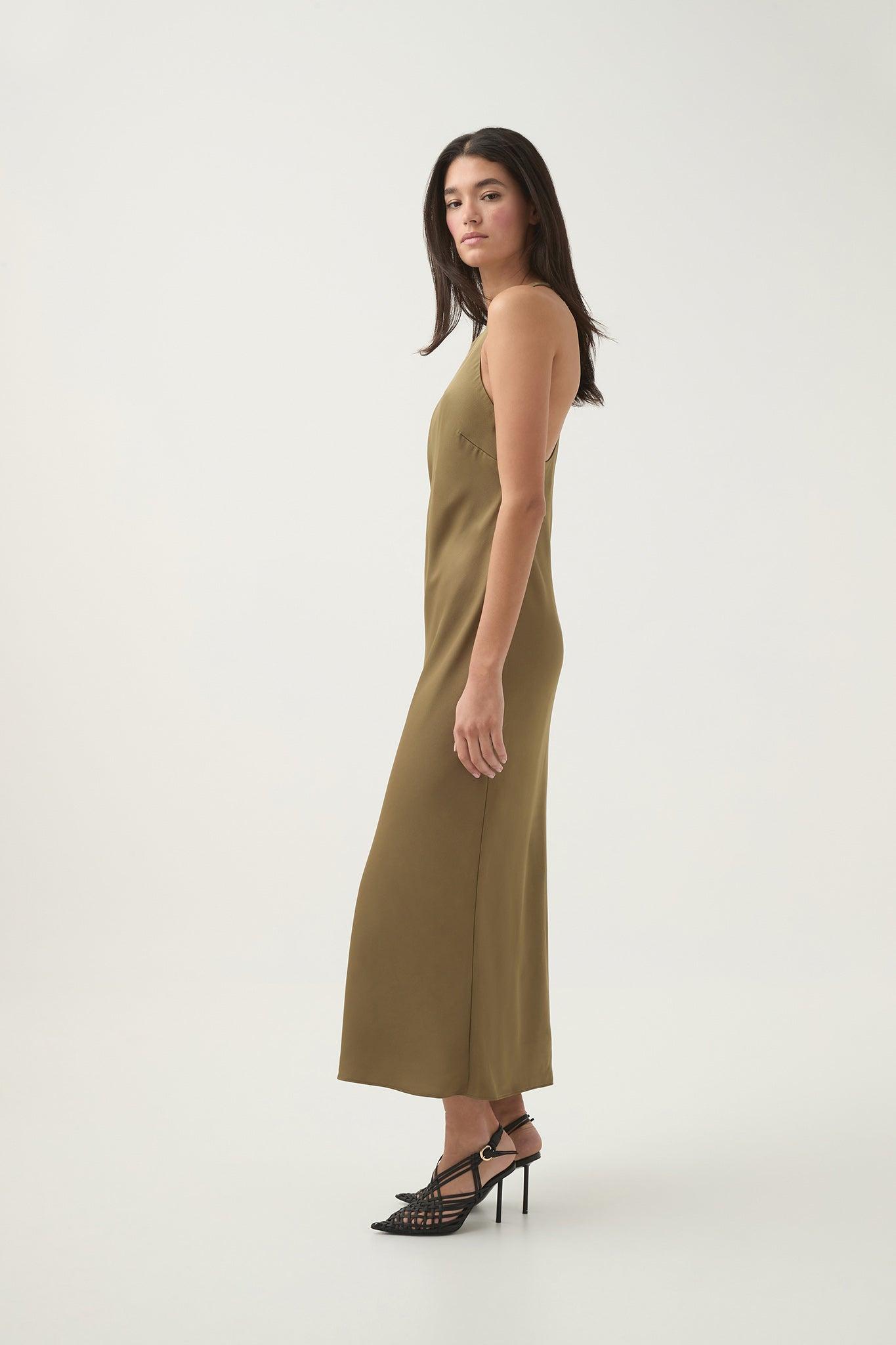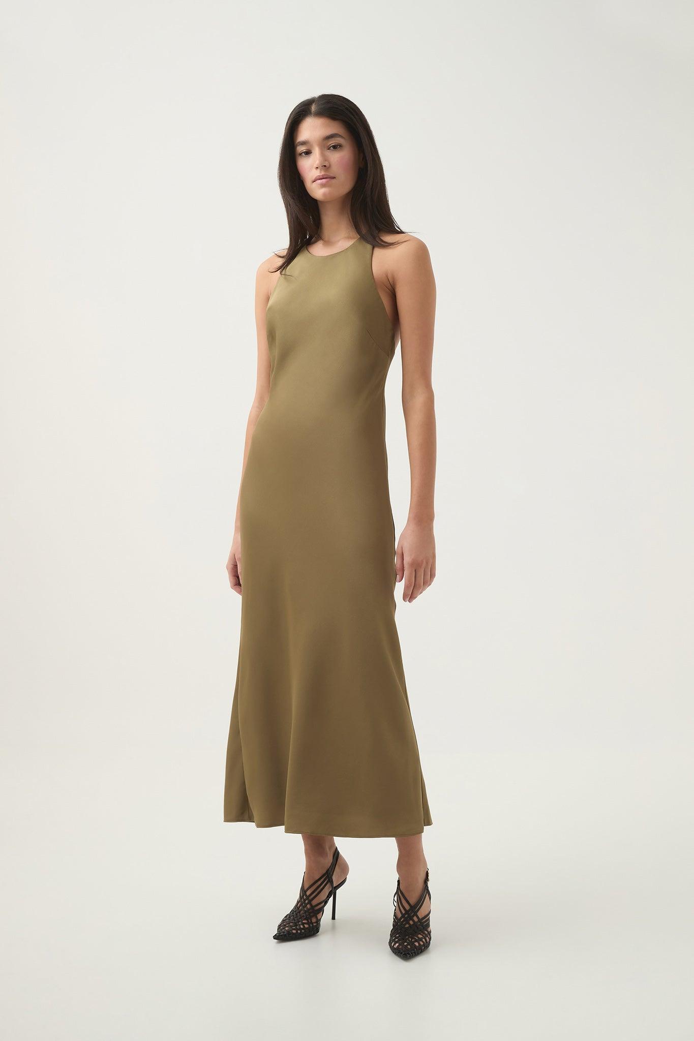 PRODUCT DETAILS Women’s midi dress Bias cut Racer-shaped crew neckline Racerback with gold chain detail Gold eyelet and bar back detail Lined style Shop All Dresses SIZE AND FIT Model wears a size 8/S Model: 178cm/ 5'10 Bust: 78cm Waist: 63cm Hips: 92cm FABRICATION 84% Acetate 16% Polyester