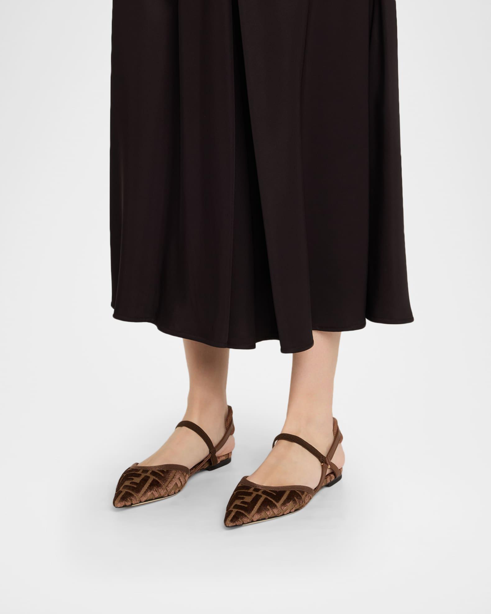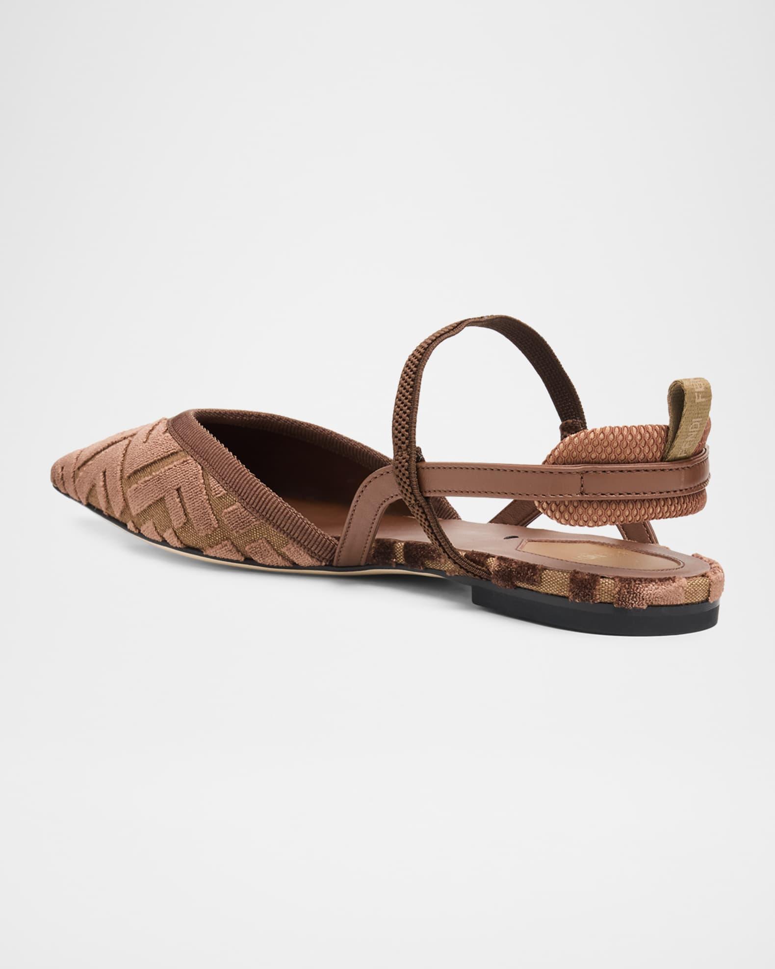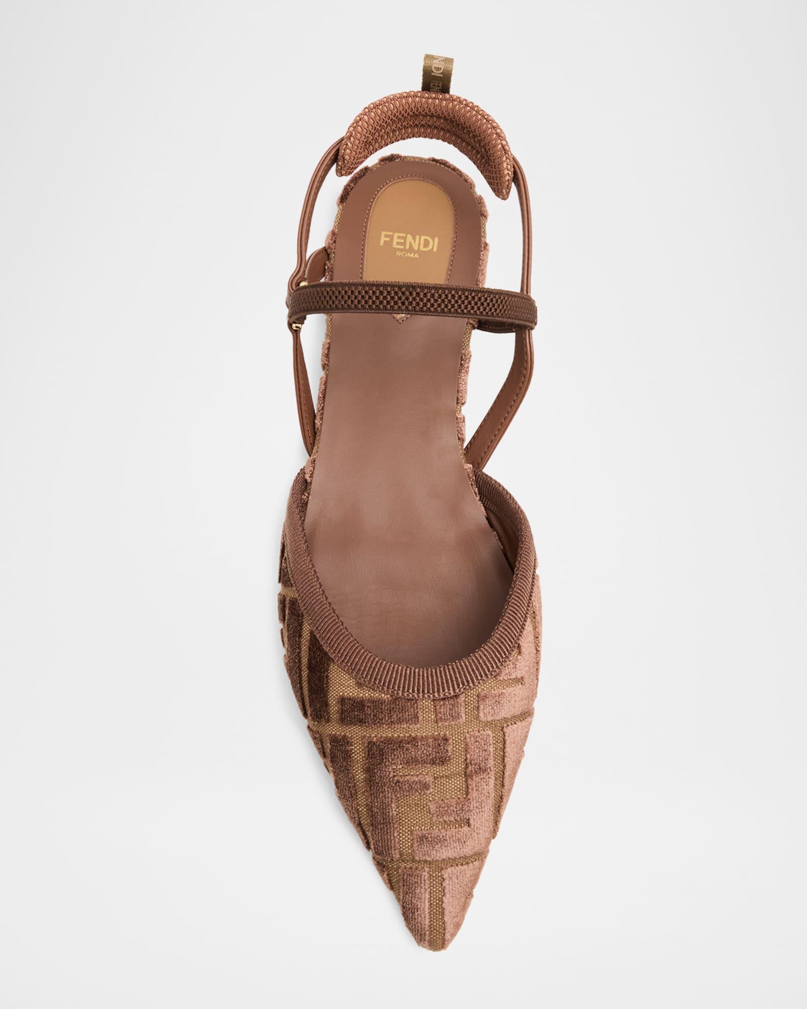 Fendi "Colibri" flats with a signature velvet jacquard FF upper 0.25 in / 10 mm flat heel Pointed toe Slingback strap Padded back of heel with pull-tab Upper: Polyester/leather/vegan leather Leather outsole Professional cleaning recommended, spot clean Made in Italy