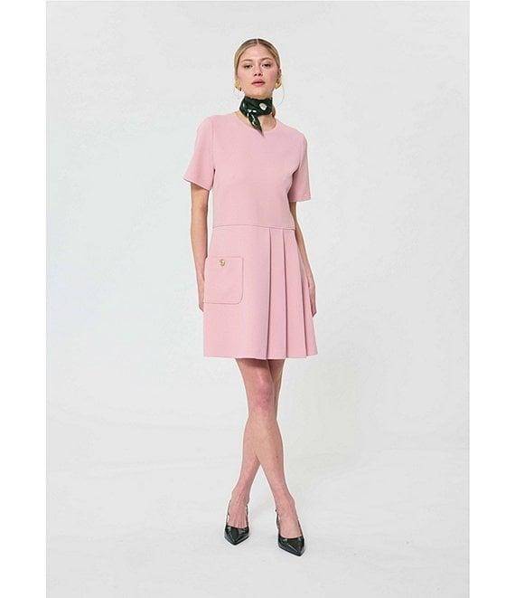 From Tara Jarmon, this dress features: Woven fabrication A-line silhouette Round neckline Short sleeves Side pleat detail Side patch pocket Straight hem Back zip closure Approx. 34.64" length Recycled polyester/viscose/elastane; lining: polyester Dry clean Imported.