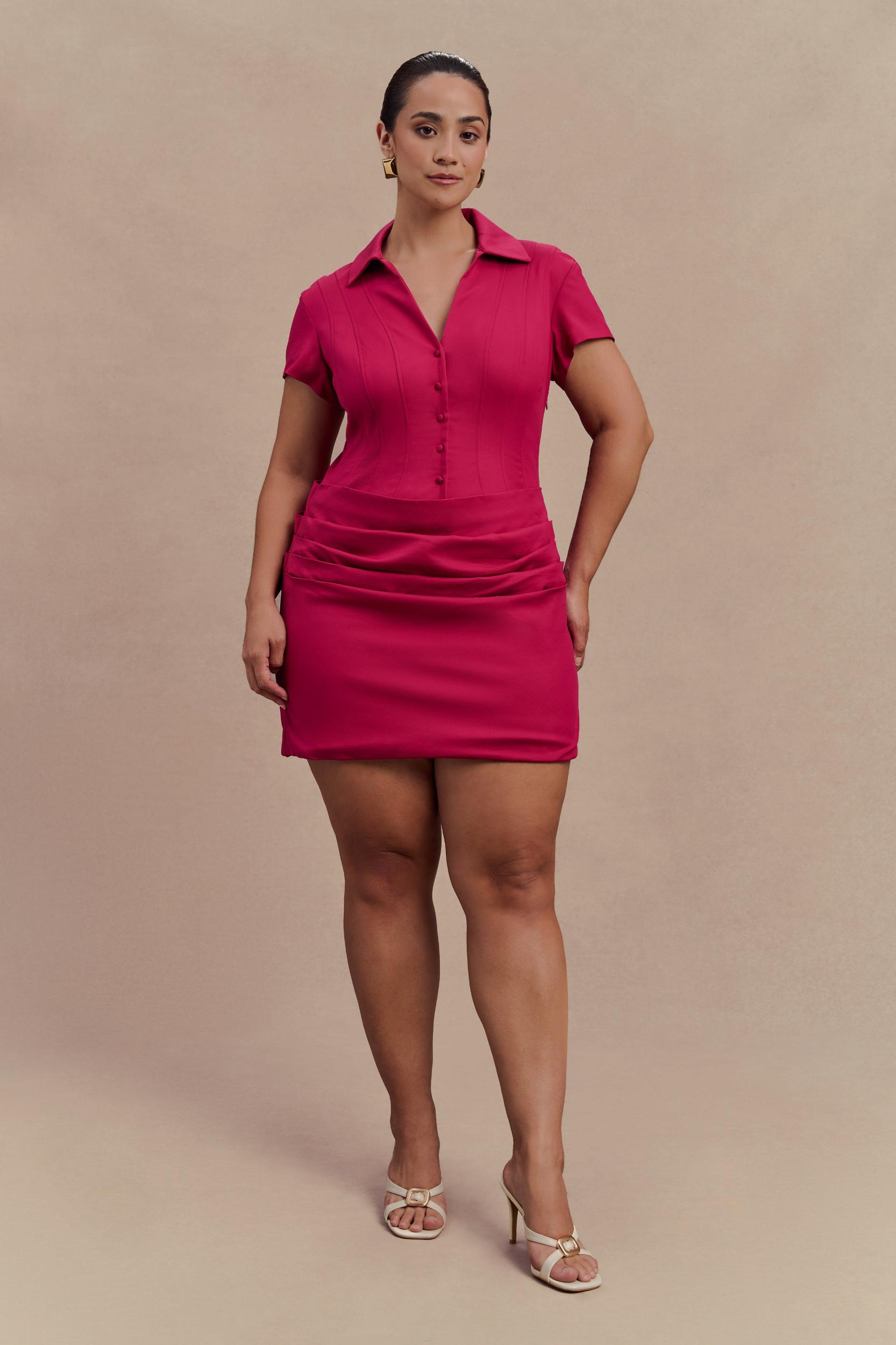 Polished cotton, effortless cool. The TARRYN Collared Cotton Mini Dress blends classic shirting details with a feminine silhouette. Featuring a sharp collar and short sleeves, this mini dress is structured through the boned bodice for a sculpted fit, while the draped skirt overlay adds movement and softness. Fully lined for comfort and coverage, this dress is the perfect balance of tailored edge and effortless charm-ideal for daytime occasions or polished summer styling.