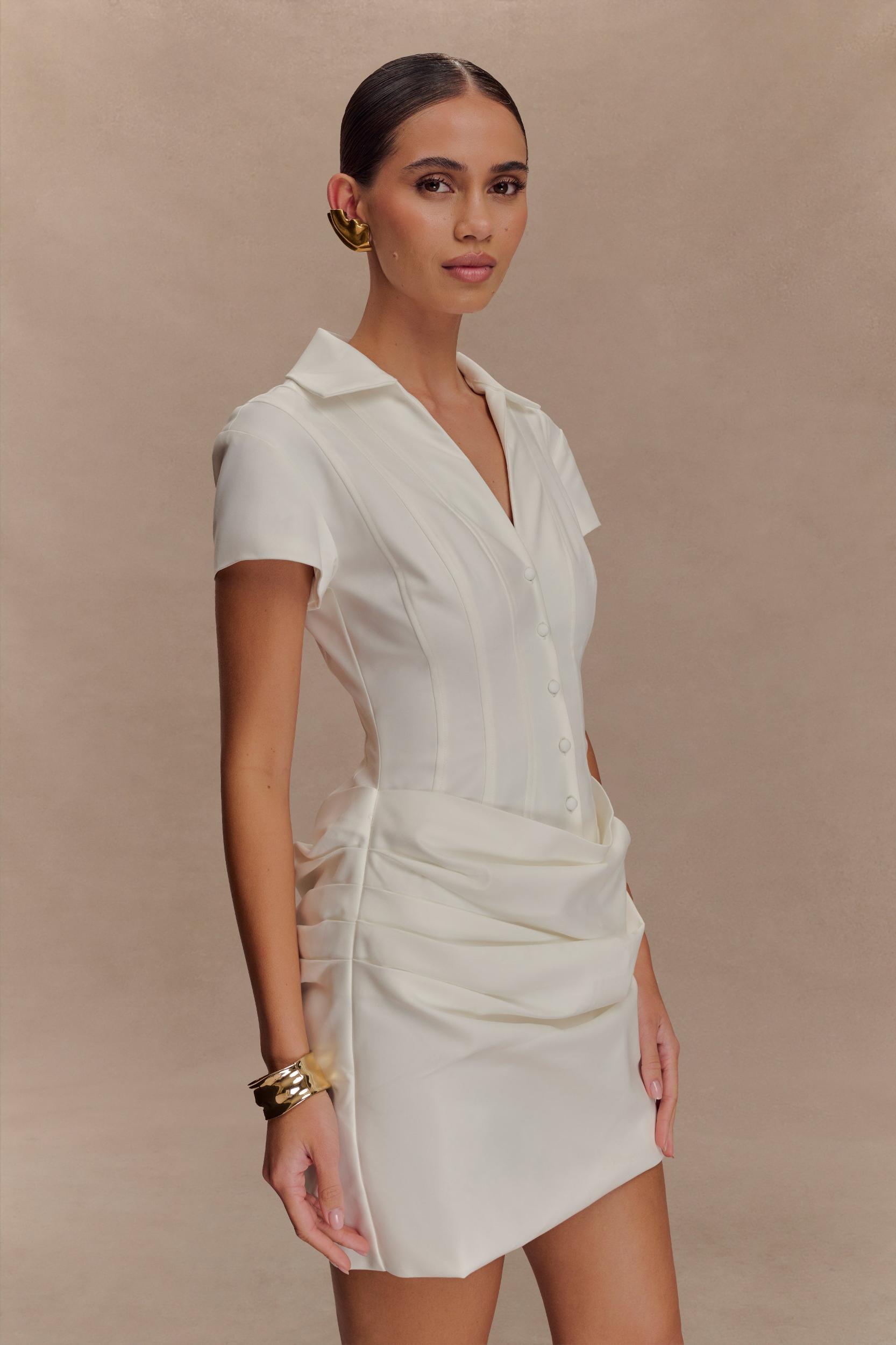 Polished cotton, effortless cool. The TARRYN Collared Cotton Mini Dress blends classic shirting details with a feminine silhouette. Featuring a sharp collar and short sleeves, this mini dress is structured through the boned bodice for a sculpted fit, while the draped skirt overlay adds movement and softness. Fully lined for comfort and coverage, this dress is the perfect balance of tailored edge and effortless charm-ideal for daytime occasions or polished summer styling.