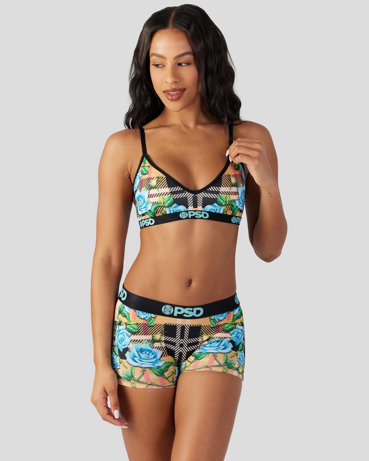 Preppy meets floral with this new woman’s look that features a designer-inspired plaid print. The Tartan Floral Boy Short is made from a silky poly blend with a comfortable full coverage, keep-you-in fit. The PSD boy shorts are perfect for everyday wear and working out.