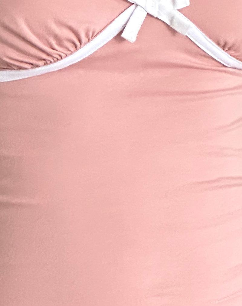 Fitted short sleeve top with a deep V neckline and regular length in a soft pink lady lycra finished with a contrast binding along the neckline and under cup and a small centre front bow in white. Complete the look with our classic mini skirt, Casini. MODEL WEARS SIZE: EXTRA SMALL - MODEL HEIGHT:5'7