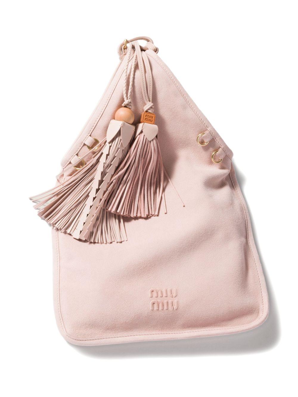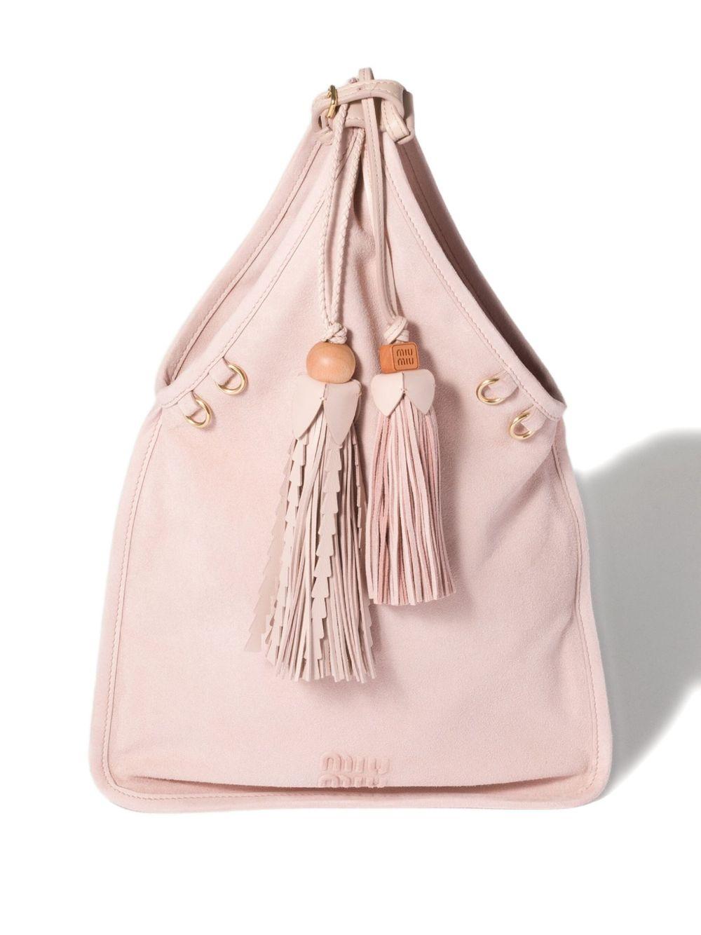 Miu Miu tassel-embellished leather tote bag | Pink | pink | leather construction | embossed logo | gold-tone hardware | drawstring closure | tassels | Lamb Suede | Tote Bags | Bags | Women