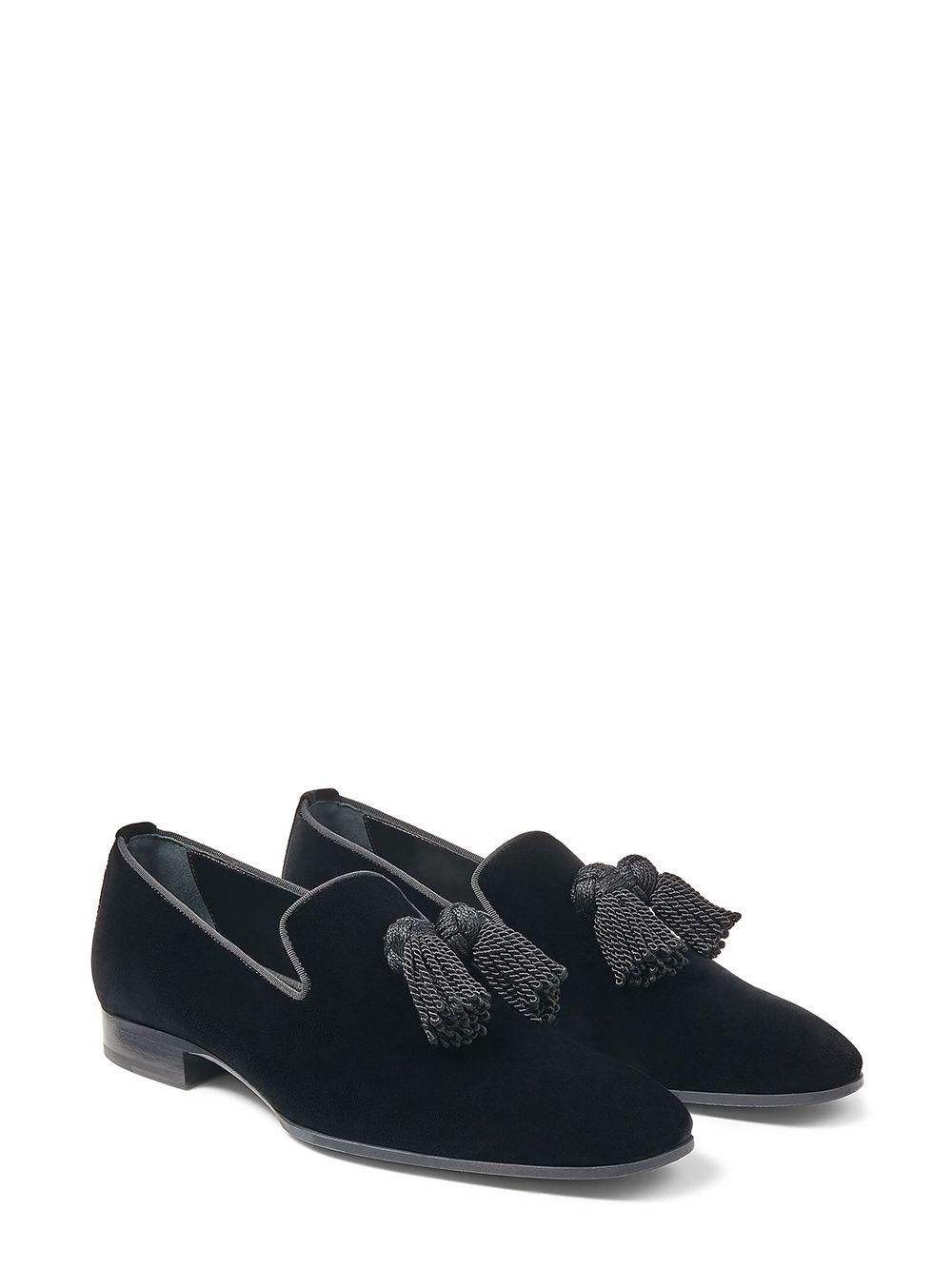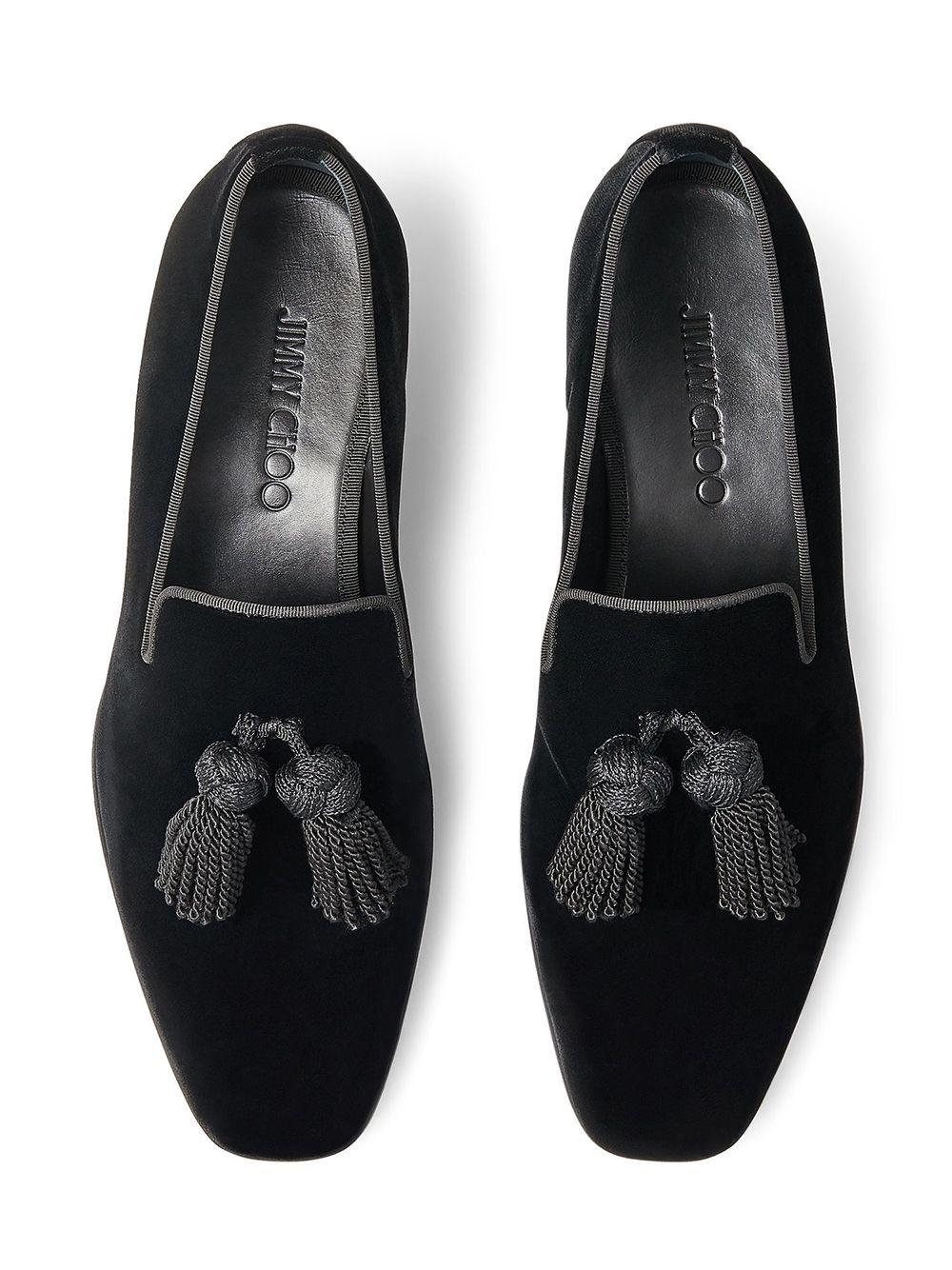 Jimmy Choo tasseled Foxley loafers | Black | black | calf leather/velvet | tassel detail | branded insole | almond toe | slip-on style | low block heel | Calf Leather/Calf Leather/Velvet | Loafers | Shoes | Men