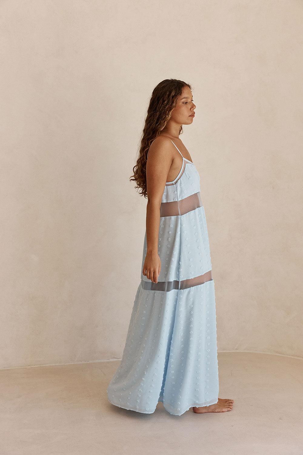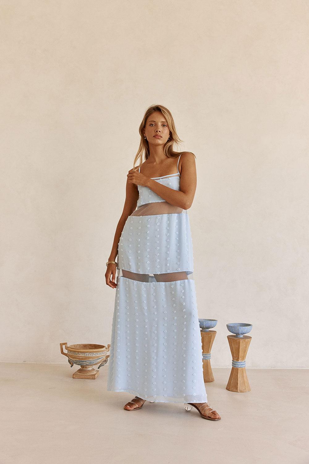 A feminine, chic style sure to turn heads. The Tassia Dress is made from a delicate yoryu fabric with a textured spot throughout in a powder blue hue. It is a boxy style featuring thin adjustable straps, sheer mesh panels and a flouncy maxi length hem. Designed exclusively by Sabo.