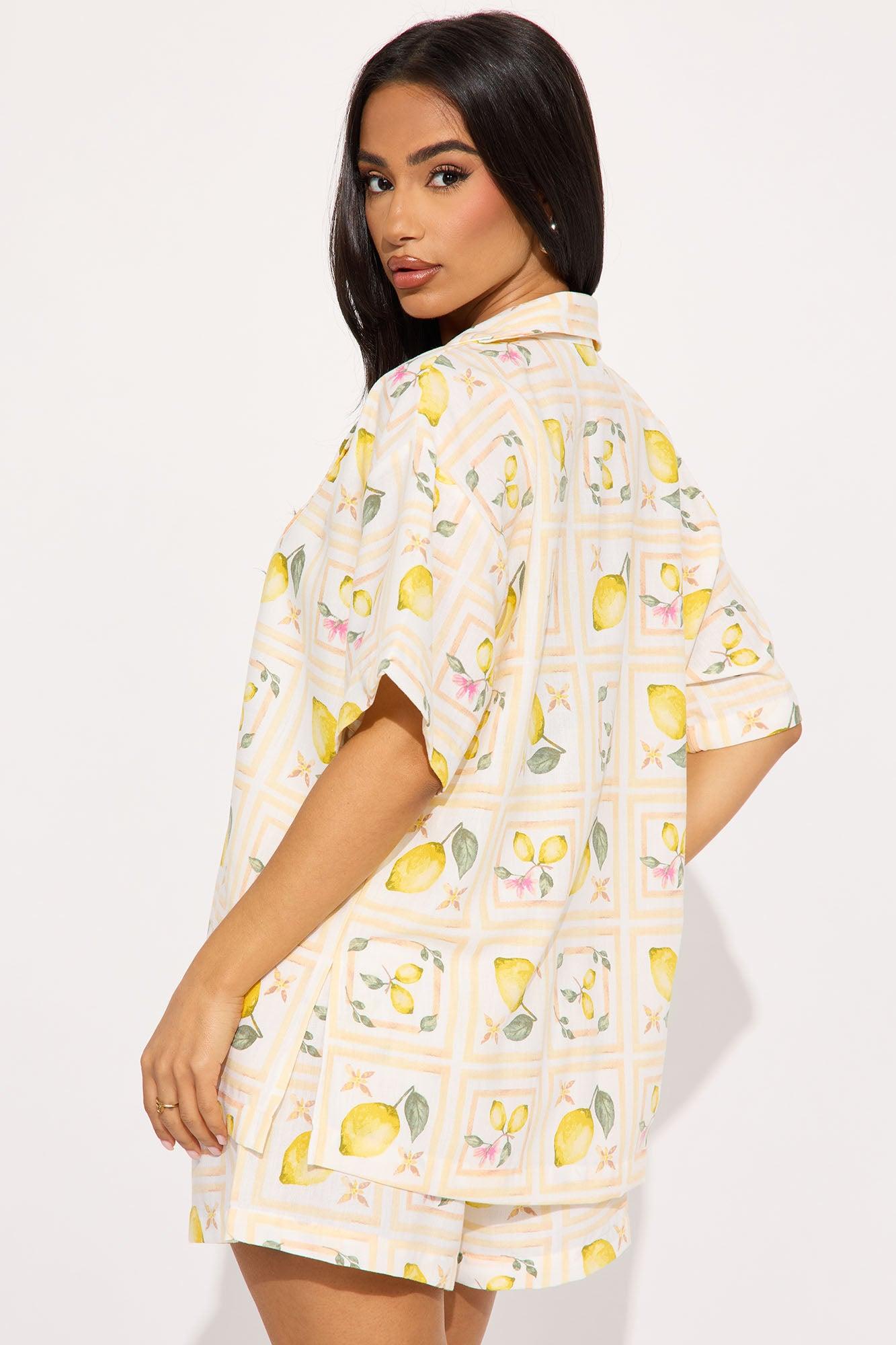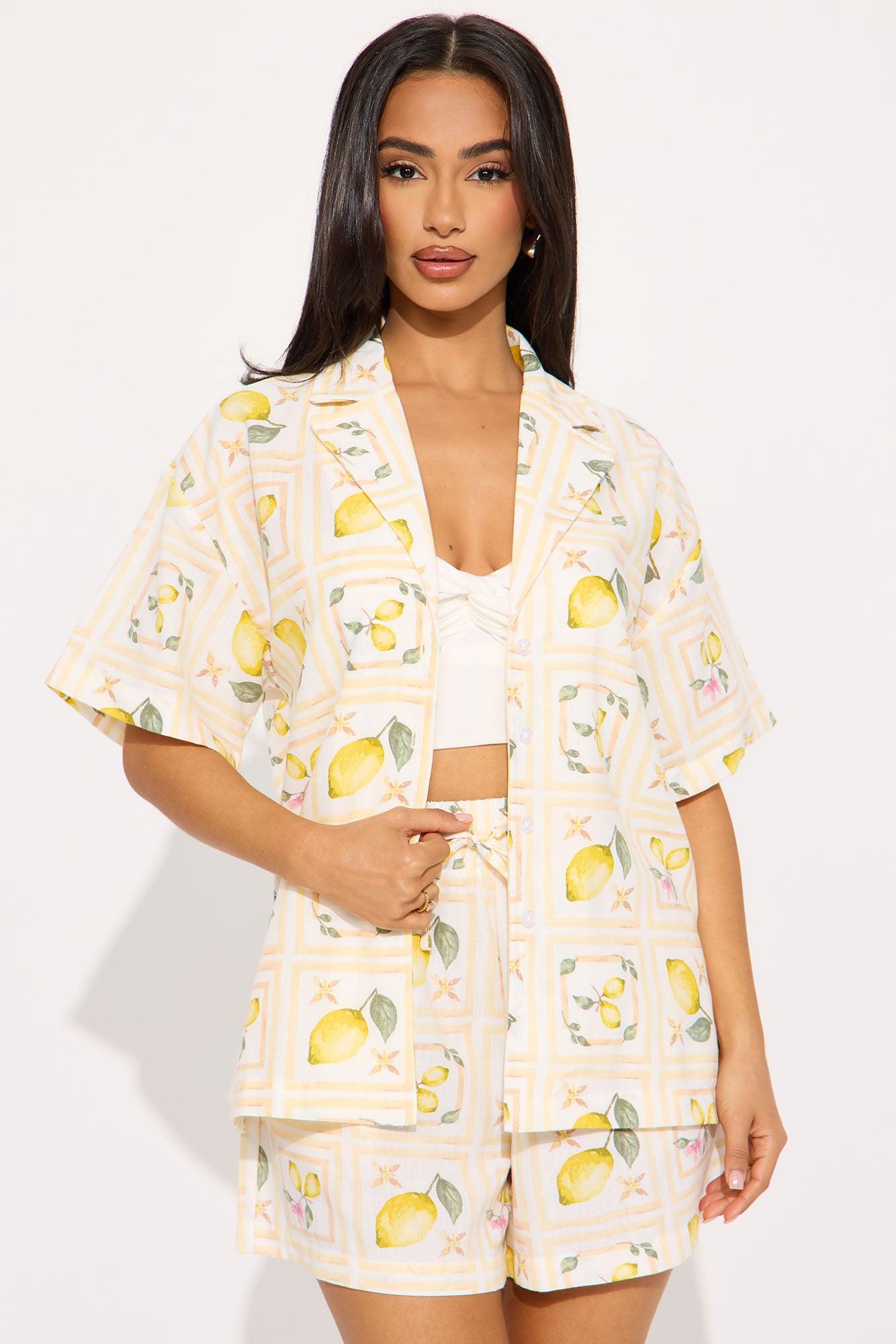Available In White/combo And Yellow/combo. Linen Shirt And Short Set Short Sleeve Button Up Elastic Waistband With Drawstring Side Pockets Disclaimer: Print Placement Will Vary Top and Shorts: 100% Polyester Imported