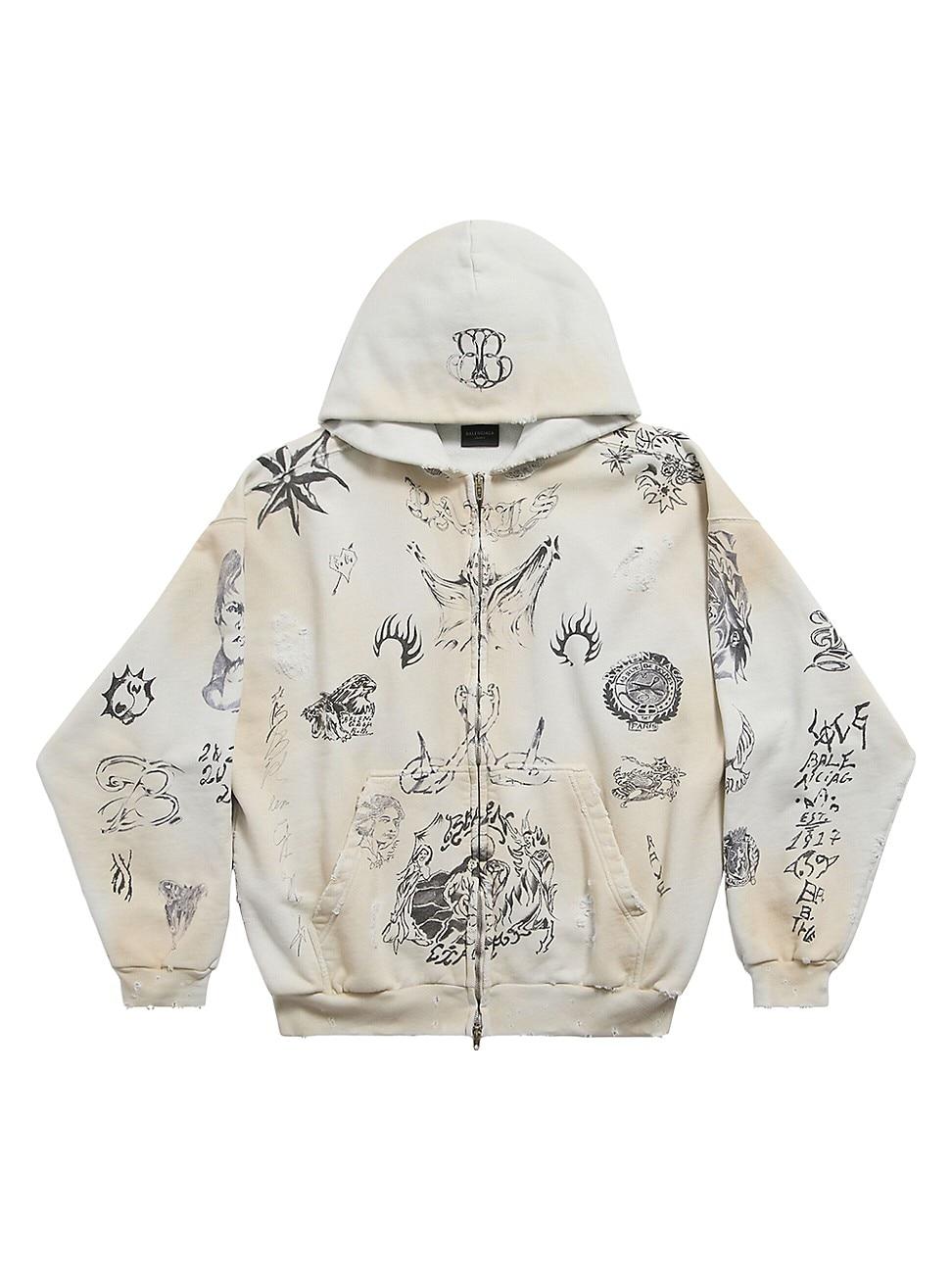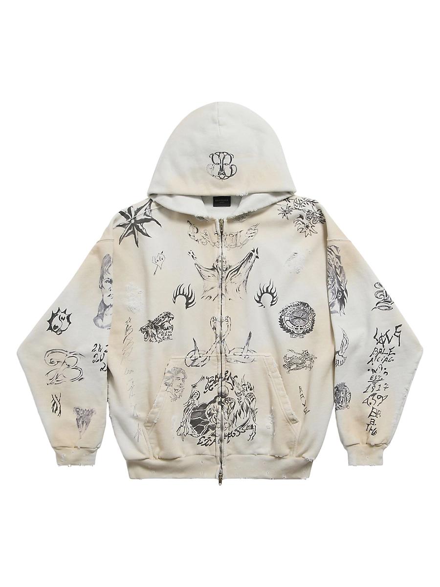 Zip-up hoodie heavy fleece is from look 76 of Balenciaga summer 24 collection. Heavy fleece This item is unisex Medium fit Hood without drawstring Dropped shoulders Double-ended zip fastening 2 pockets at front Gathered at cuffs and waistline Tat artwork printed throughout Destroyed and dirty effect Drying cleaning only Made in Portugal. Lsd Rtw - Balenciaga Rtw > Balenciaga > Saks Fifth Avenue > Barneys. Balenciaga. Color: Off White Black. Size: Medium.