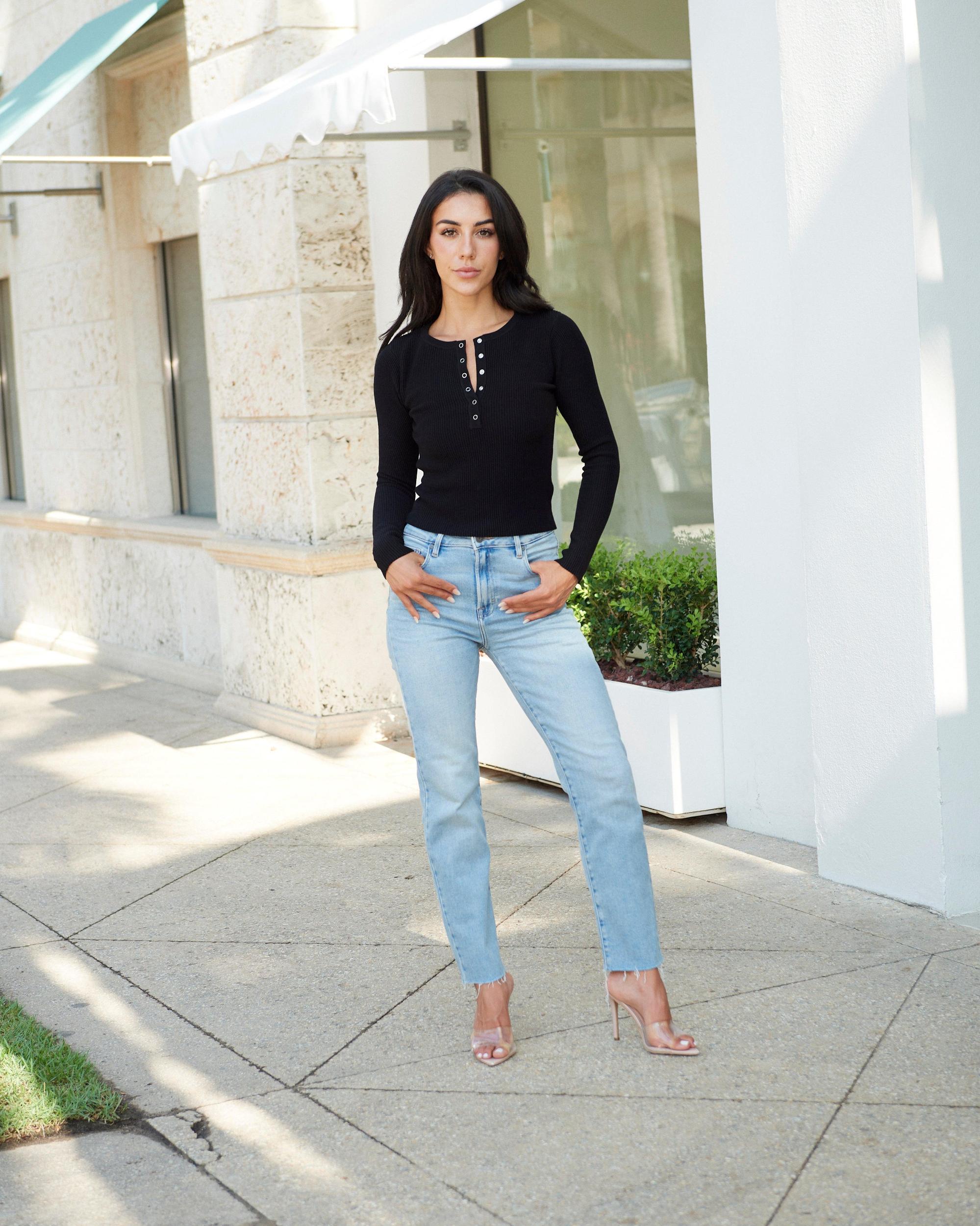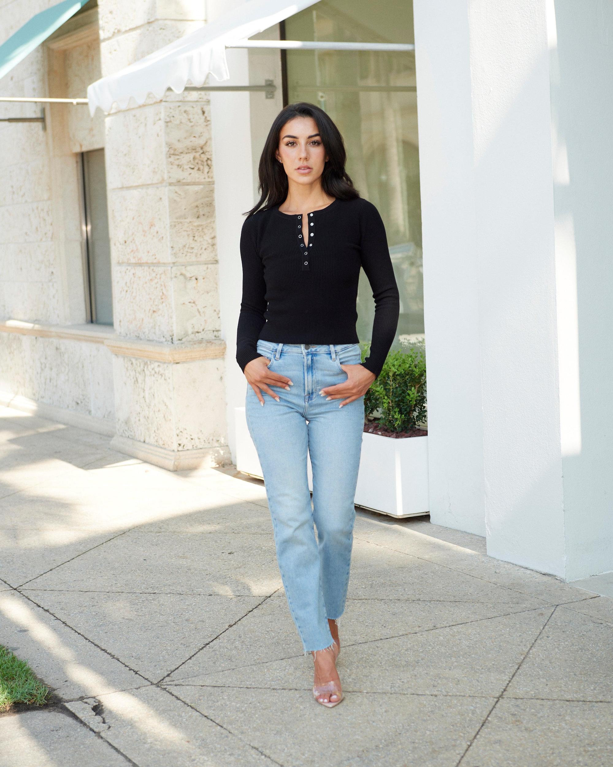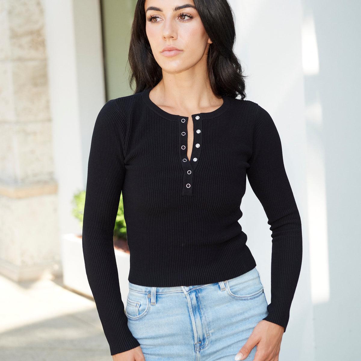 The Tatiana Knit Top is cute and perfect for fall. This ribbed top features a round neckline, a snap henley closure, and long sleeves. Its cropped length and fitted silhouette add a touch of style to any outfit.