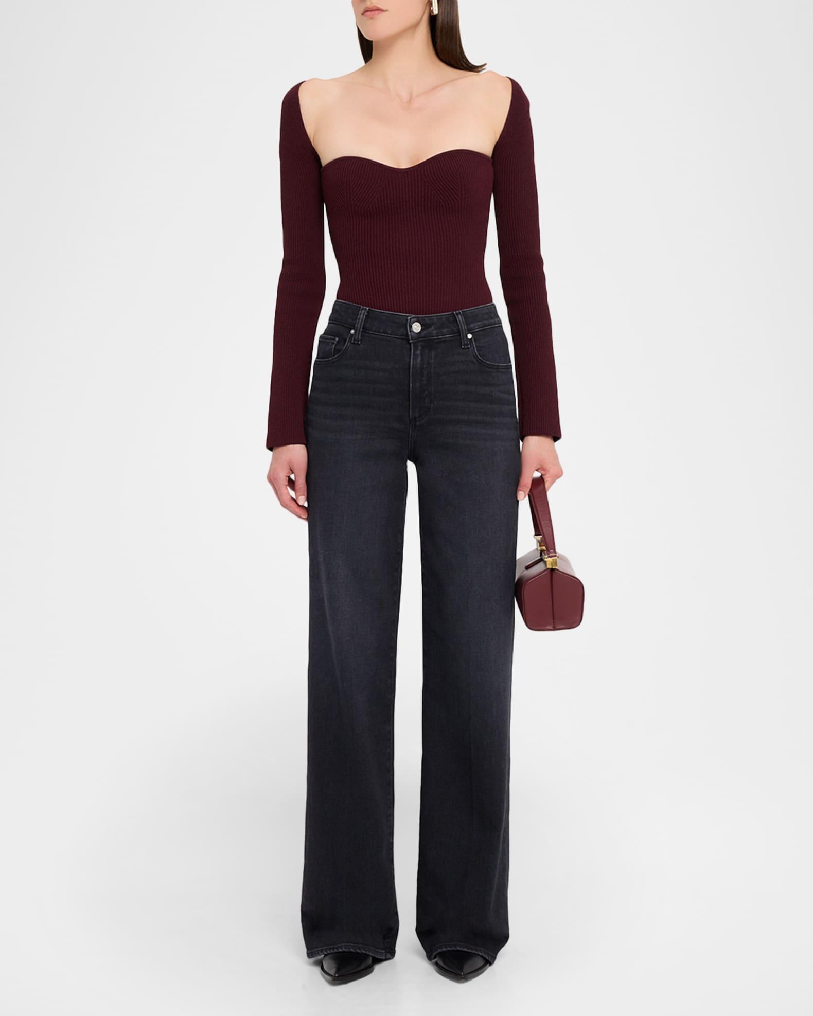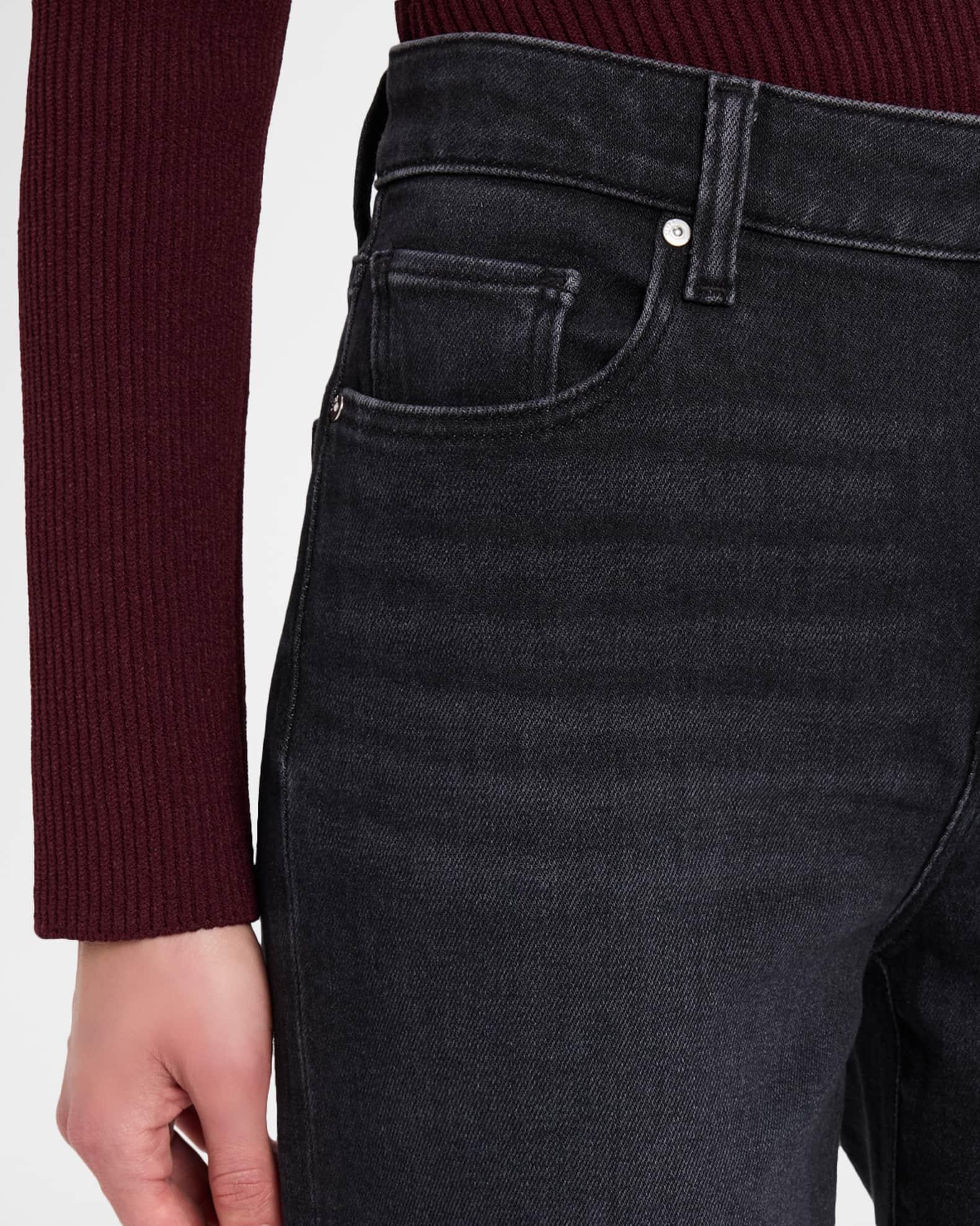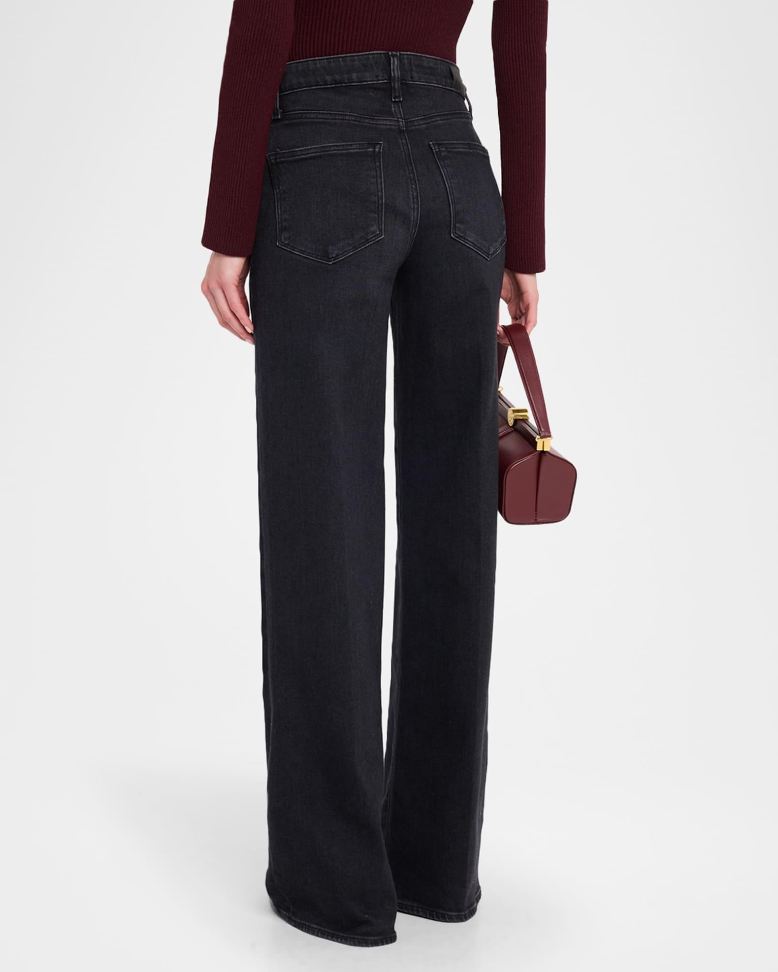 PAIGE "Tatum" jeans in black stretch denim Approx. 10.3" rise; 32" inseam High rise Five-pocket style Wide legs Full length Button/zip fly; belt loops Cotton/polyester/spandex Machine wash Imported