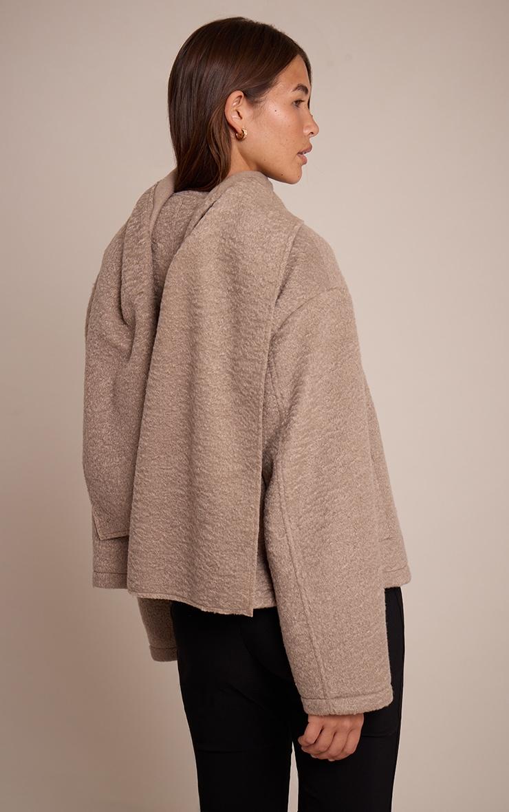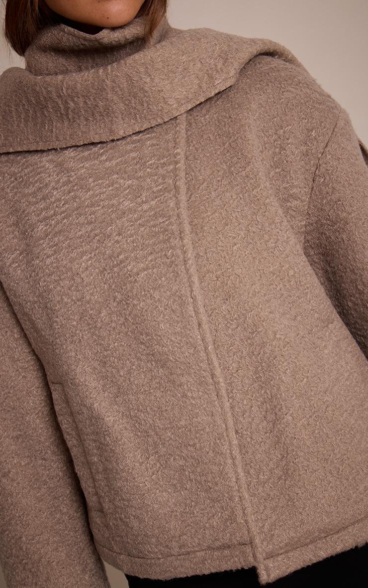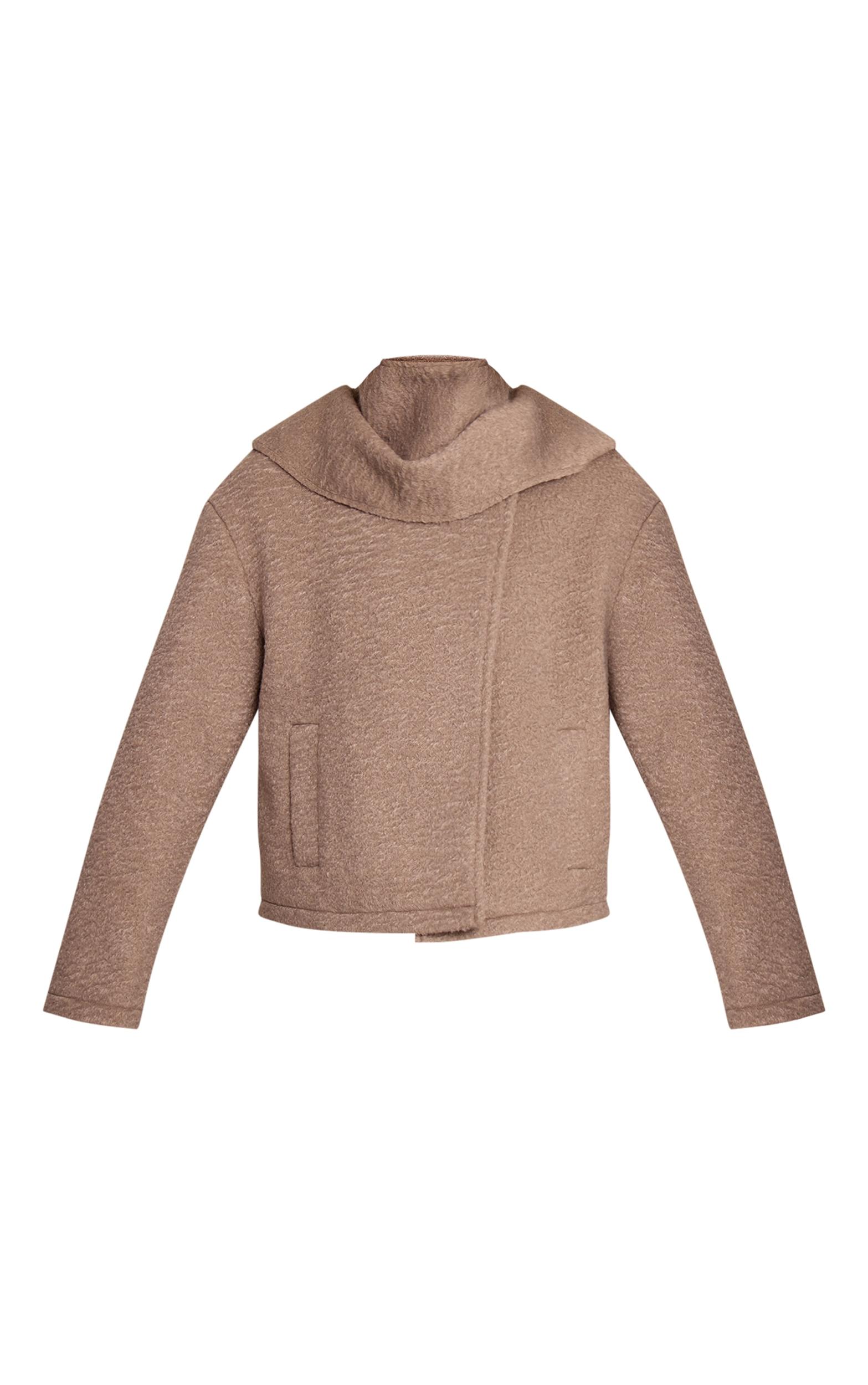 Cultivate an assured presence in the taupe boucle scarf coat, a key piece for discerning day dressing. This essential outerwear commands attention with its relaxed, boxy silhouette, featuring a refined band neckline and a subtle single-button fastening that ensures a clean line. The unique taupe boucle finish adds depth without compromising on sophisticated simplicity. Layer it over a close-fitting sweater and sharp black tailored pants for an elevated day aesthetic, grounding your confident stride with chic ballet flats. Complete the thoughtful ensemble with minimalist gold accessories for a polished finish that speaks volumes about your self-aware style.Length approx 48.5cm/19inch (Based on sample size S)Model wears size SModel Height - 5ft 9inchp]:!mb-4inch>Brand: PrettyLittleThingCategory: OuterwearProduct type: JacketColor: Taupe.Material: BoucleOccasion: Day