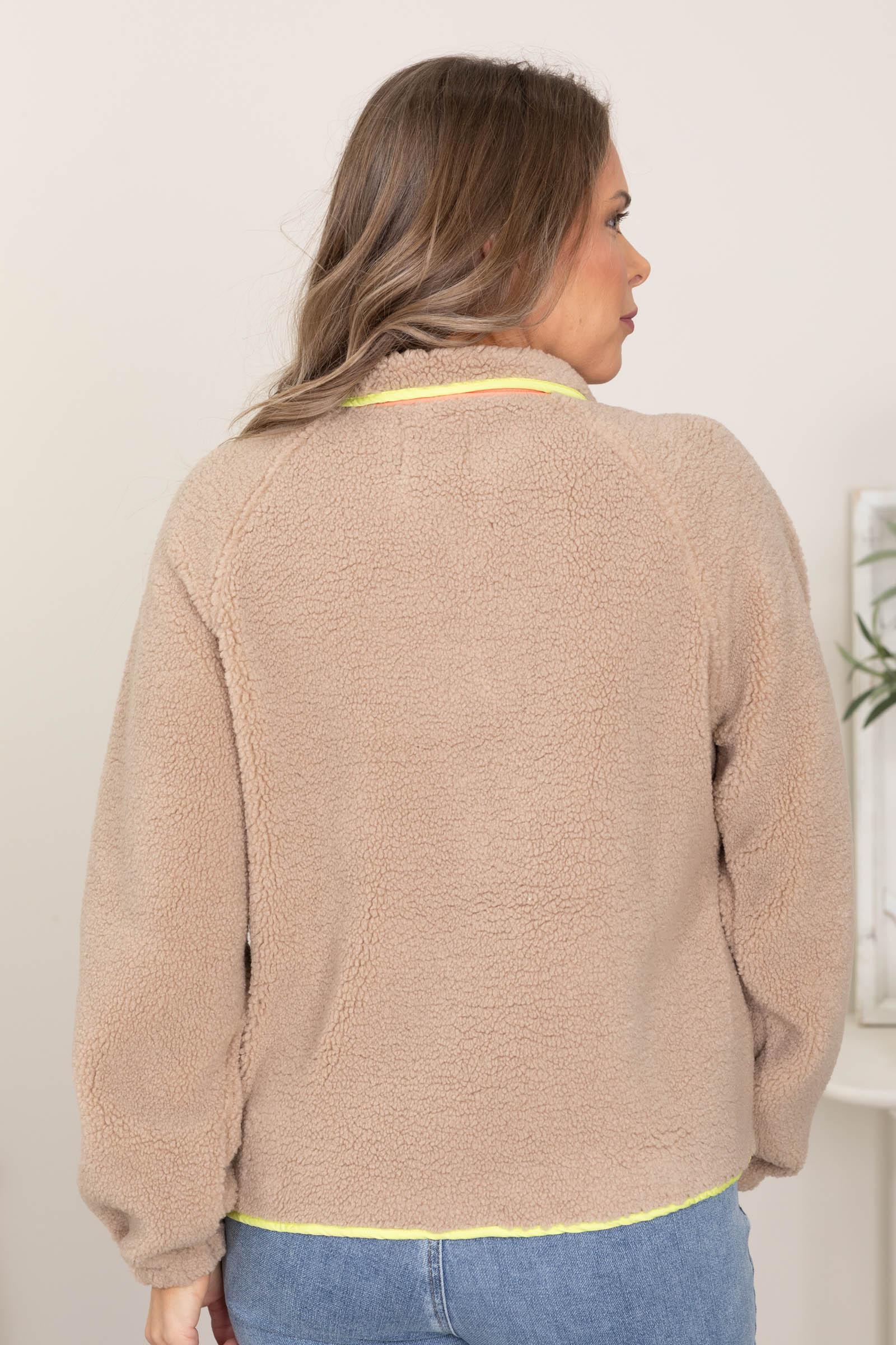 Product Details Colors: Taupe, Coral, Neon Yellow, Black Print: Textured Solid/Colorblock Neckline: Half Button Up Sleeve: Long Sleeve Hemline: Straight Brand: LovLov Material and Care Shell: 100% Polyester Contrast: 100% Polyester Machine Wash Cold Hang/Line Dry Size and Fit Small: Bust 42" Waist 42" Length 24" Medium: Bust 45" Waist 45" Length 24.5" Large: Bust 48" Waist 48" Length 25" X Large: Bust 51" Waist 51" Length 25.5" Erica is 5’7” and wearing her true size small