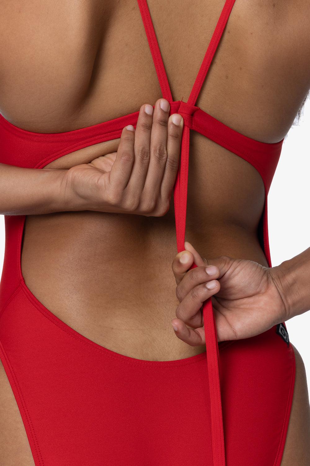 The Taya is an adjustable women's medium/full-coverage swim one-piece swimsuit. This design includes two over-the-shoulder straps and fun back detail that allows for an even distribution of tension along the shoulders and back and a fun tie-back feature. Feel secure no matter how tough your training is, the Taya one-piece swimsuit will keep up with any challenge. Features: Good for: Swimming, water polo, lifeguarding, paddling, ocean and pool activities Tie-Back one-piece swimsuit Medium/Full Coverage Coverage 4 Unpadded Lined for maximum privacy Tagless for maximum comfort Chlorine proof 2-way stretch Reinforced stitching Fabric Composition: Foreverever Fabric® 100% Polyester Elastic contains trace amounts of Latex Care Instructions: Hand wash cold Hang dry Do not iron, dry clean or bleach