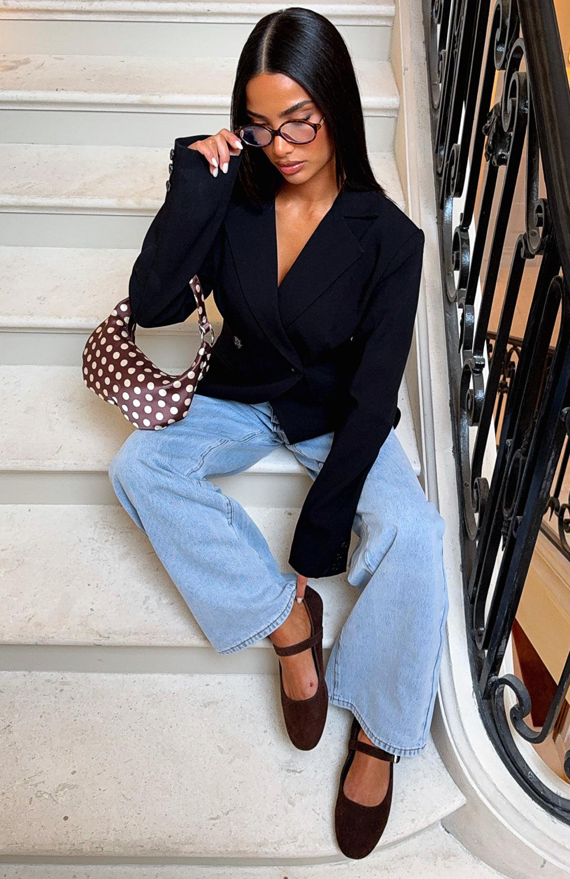 Elevate your everyday elegance with the Tayla Ballet Flats in Chocolate Faux Suede These flats feature a timeless closed round toe, a delicate strap across the vamp, secured with an adjustable gold buckle and closed heel counter. We’re absolutely obsessed with this versatile piece that effortlessly combines comfort and style.