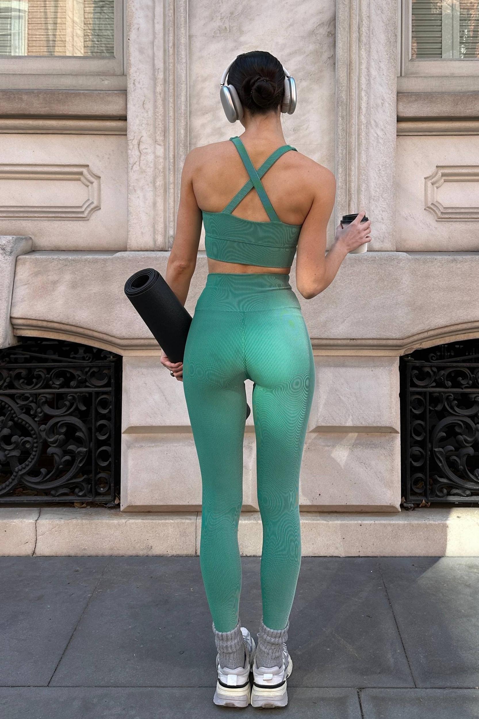 Two-tone ribbed fabric 66%Recycled Nylon, 11% Polyester, 23% Spandex 28" inseam Full length High-wiast Model is wearing size small