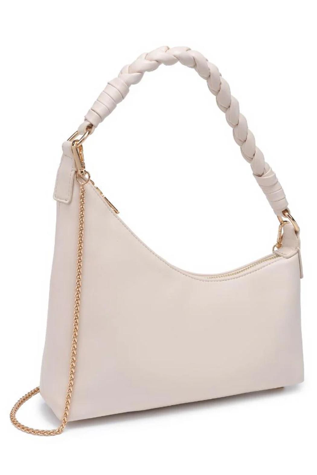 Exterior Details: Asymmetrical Design, Braided Handle, Gold Hardware, Detachable Chain Strap