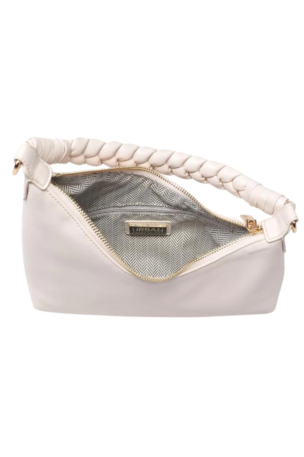 Elevate your style with our Vegan Leather Clutch. The zipper closure unveils an artful asymmetrical design, complemented by a chic braided handle and gold hardware. Inside, discover a printed fabric lining and a convenient zip pocket for your essentials.