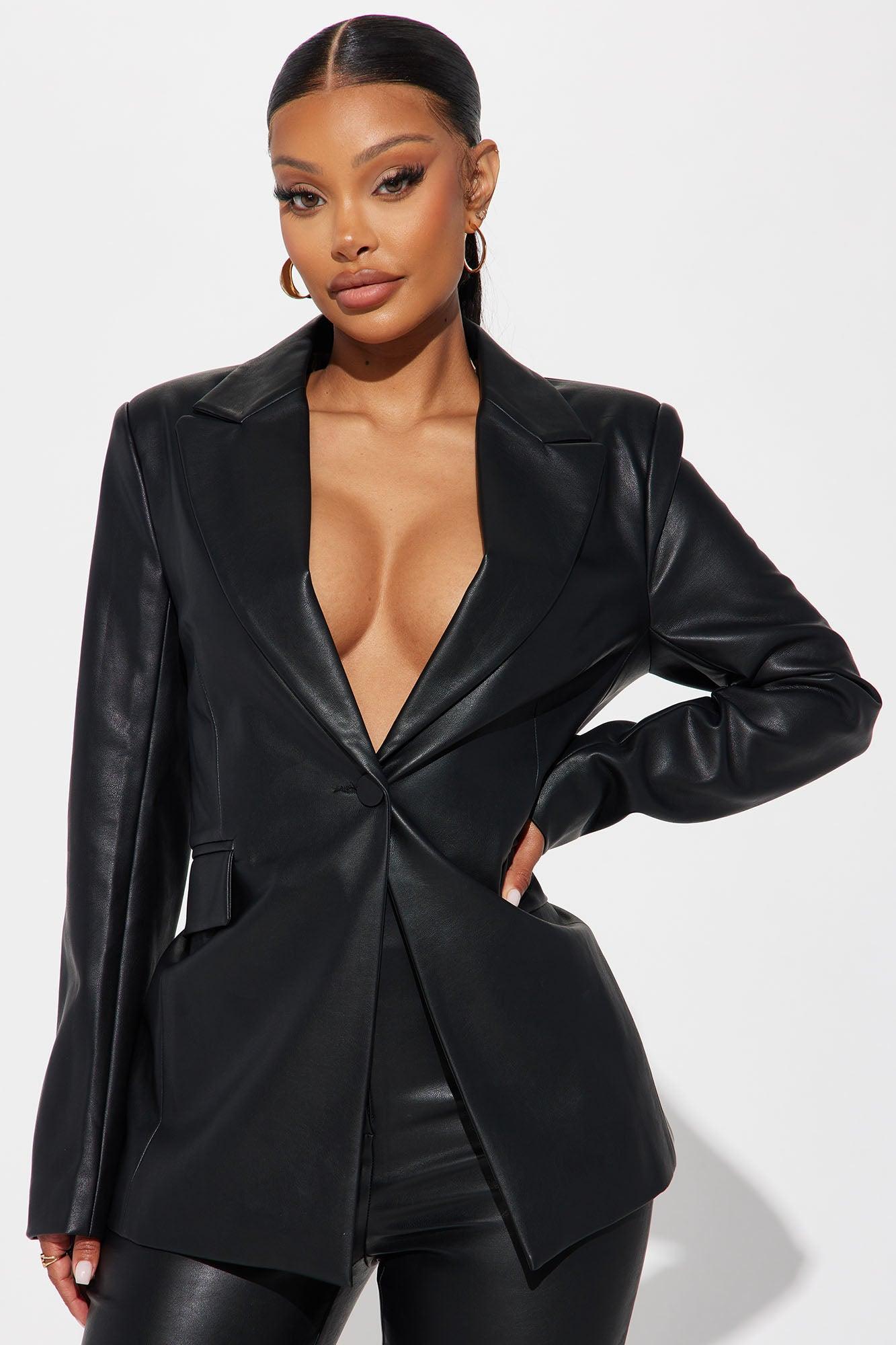 Available In Black. Faux Leather Pant Set Blazer Shoulder Pads Faux Pockets Fully Lined Trouser Clasp And Zipper Closure 26" Inseam Self: 45% Polyurethane 55% Rayon Lining: 95% Polyester 5% Spandex Imported California Proposition 65WARNING: Cancer and Reproductive Harm - www.P65Warnings.ca.gov.