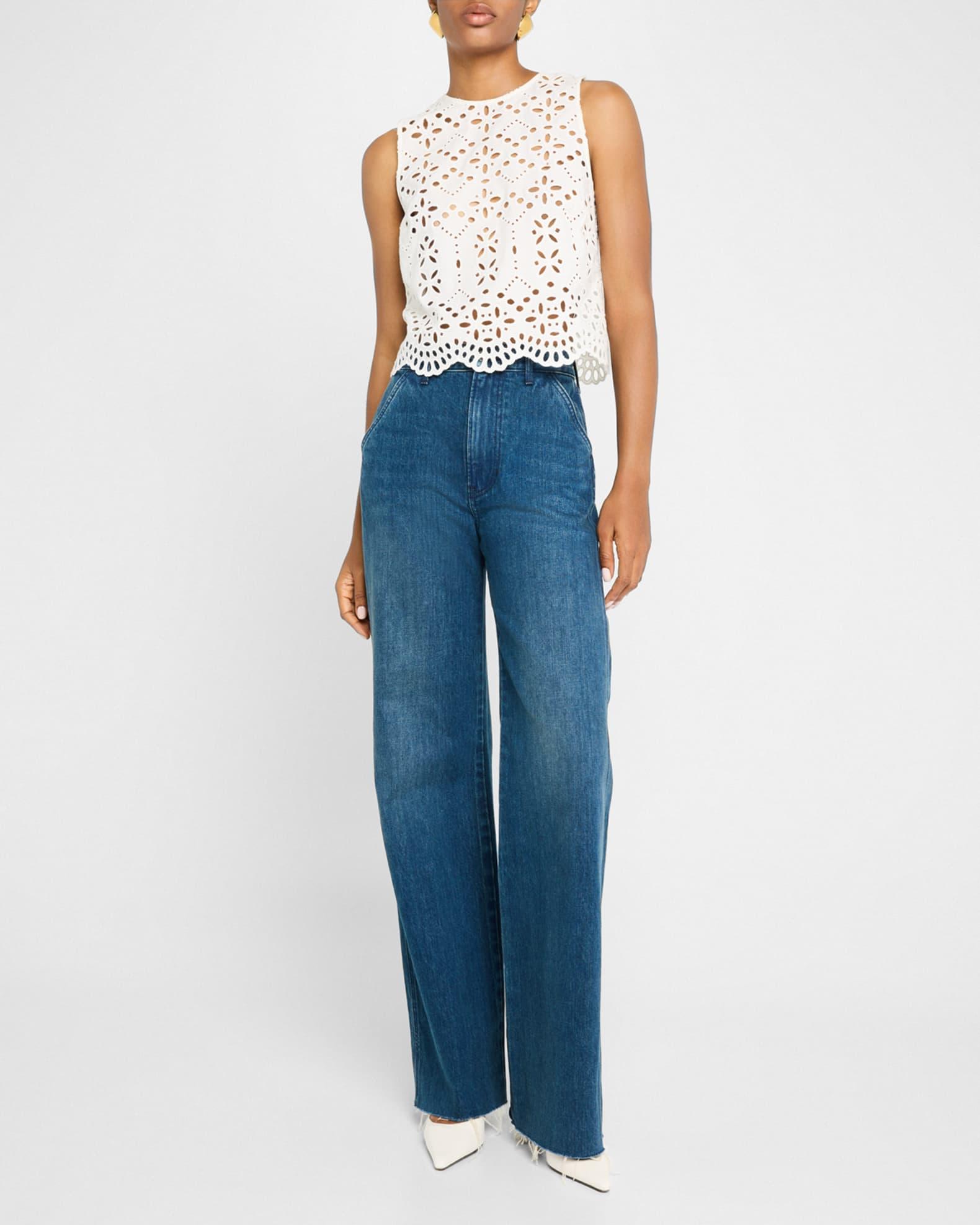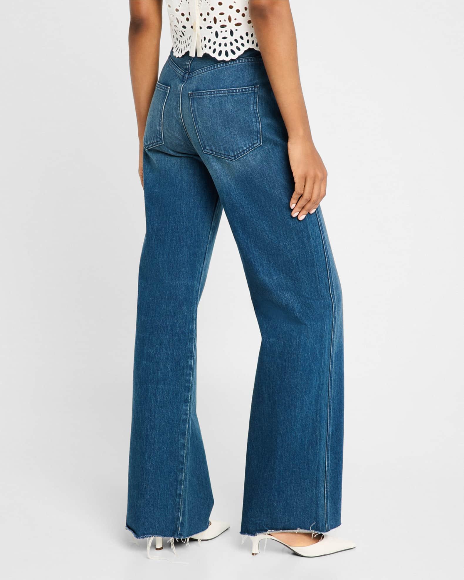 Veronica Beard "Taylor" wide-leg jeans in medium-wash denim Approx. 12" rise; 32" inseam; 22" outseam High rise Four-pocket style Easy fit Full length Button/zip fly; belt loops Cotton Machine wash cold, inside out Made in USA from imported materials Model is 5'10"/177cm.
