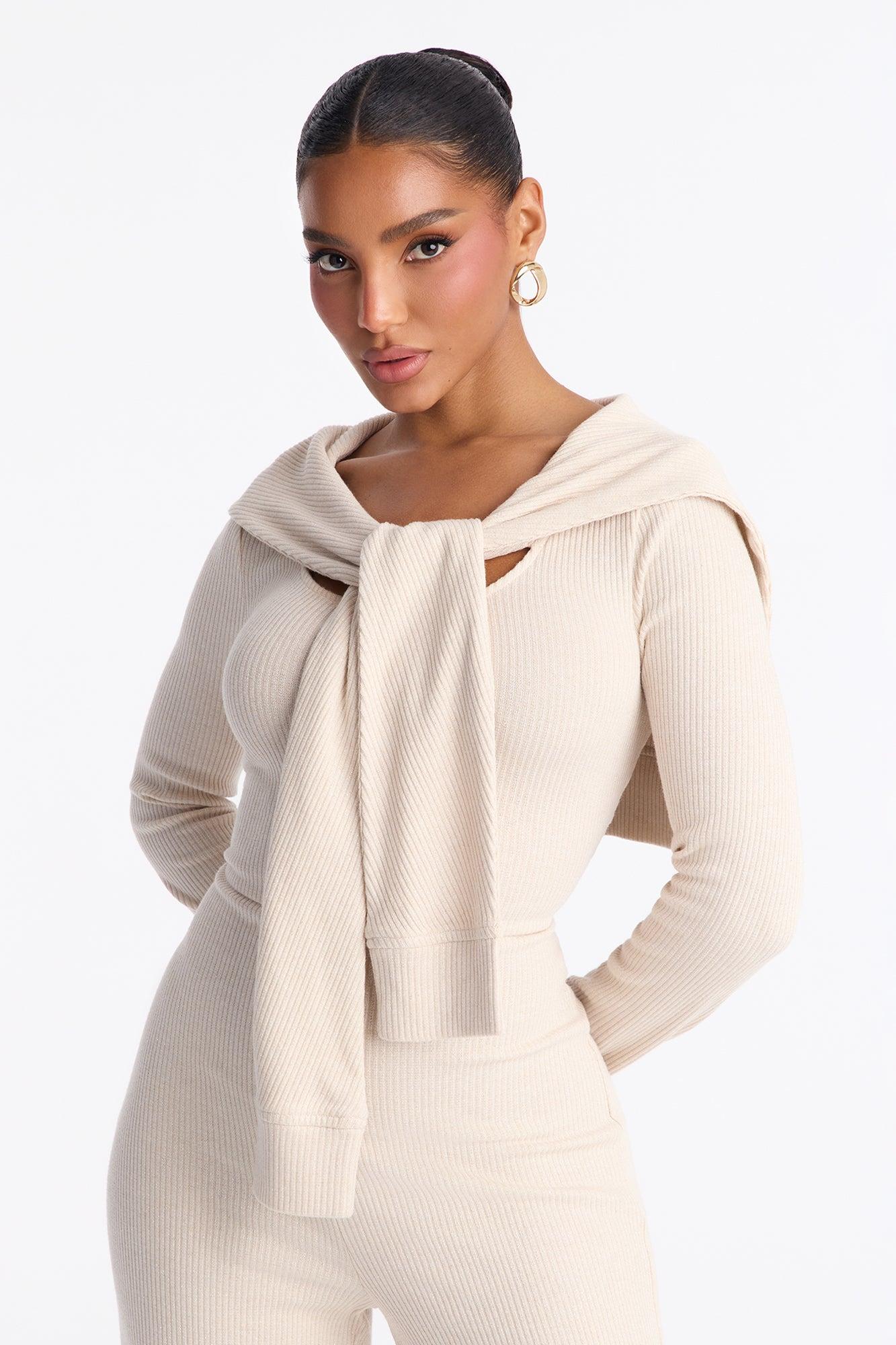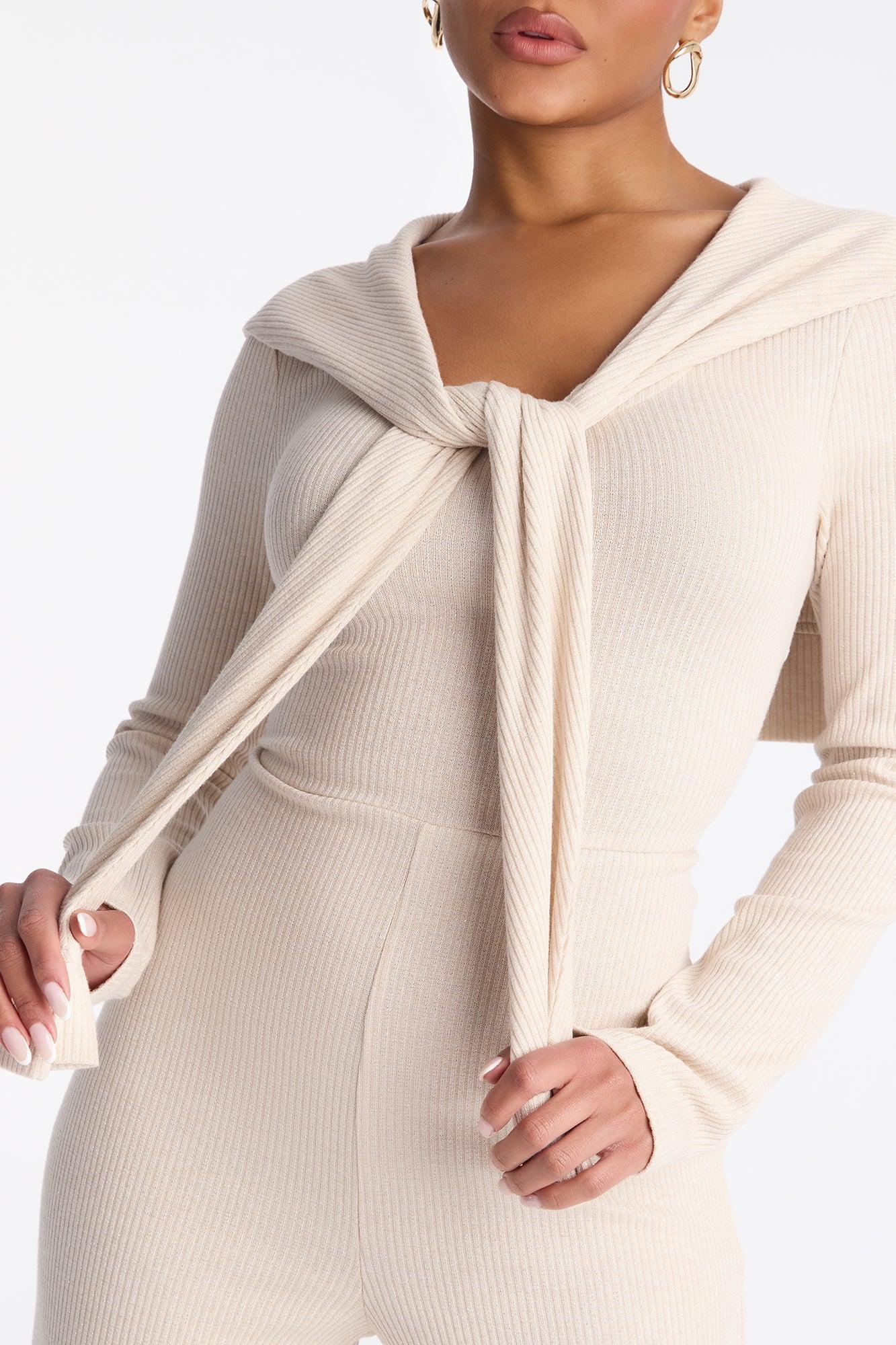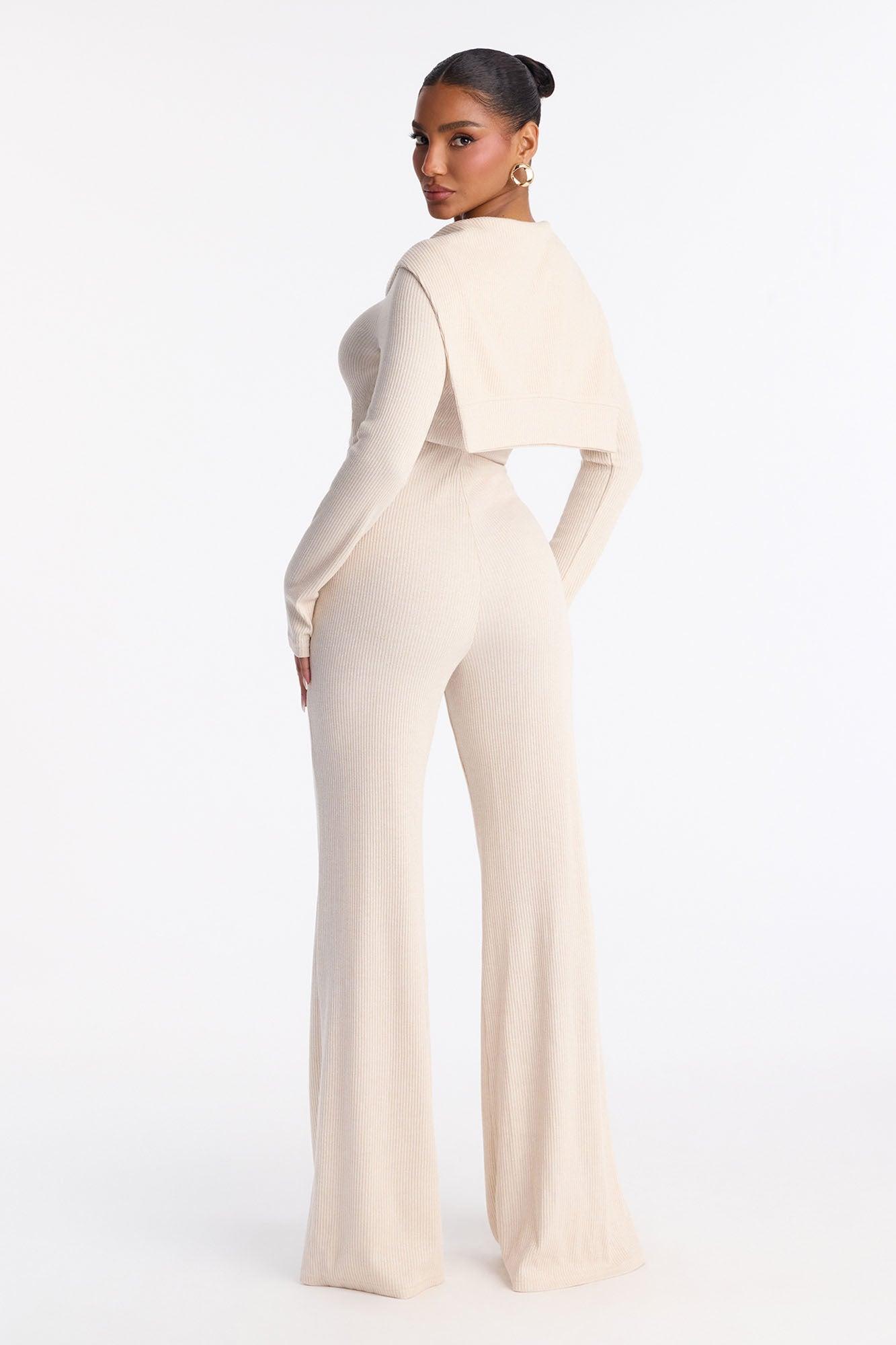 Available In Beige. Stretch Long Sleeve Scoop Neck Flare Leg Layered Sweater Detail Elastic Waistband 33" Inseam Self: 60% Polyester 35% Metallic Yarn 5% Spandex Imported California Proposition 65WARNING: Cancer and Reproductive Harm - www.P65Warnings.ca.gov.