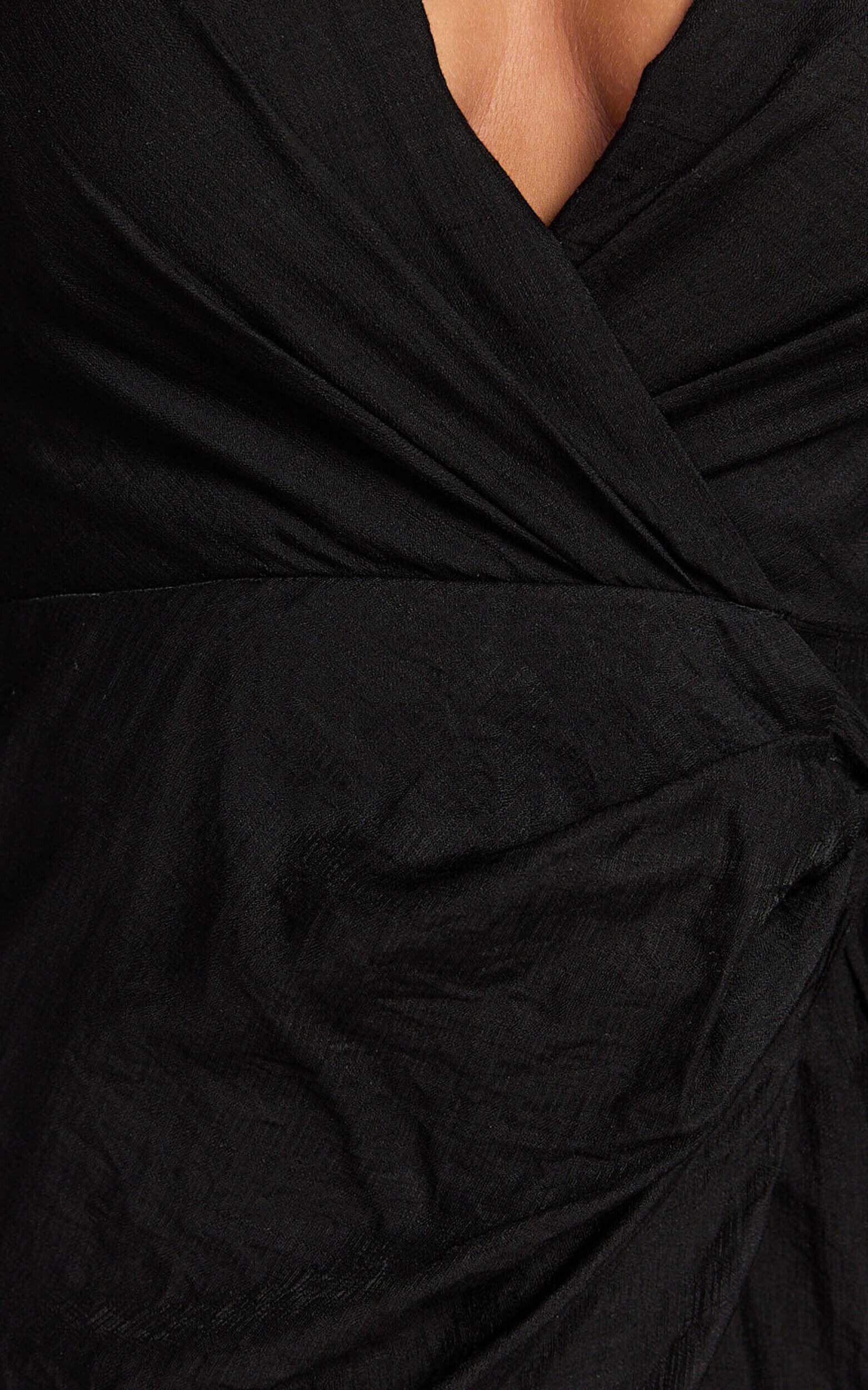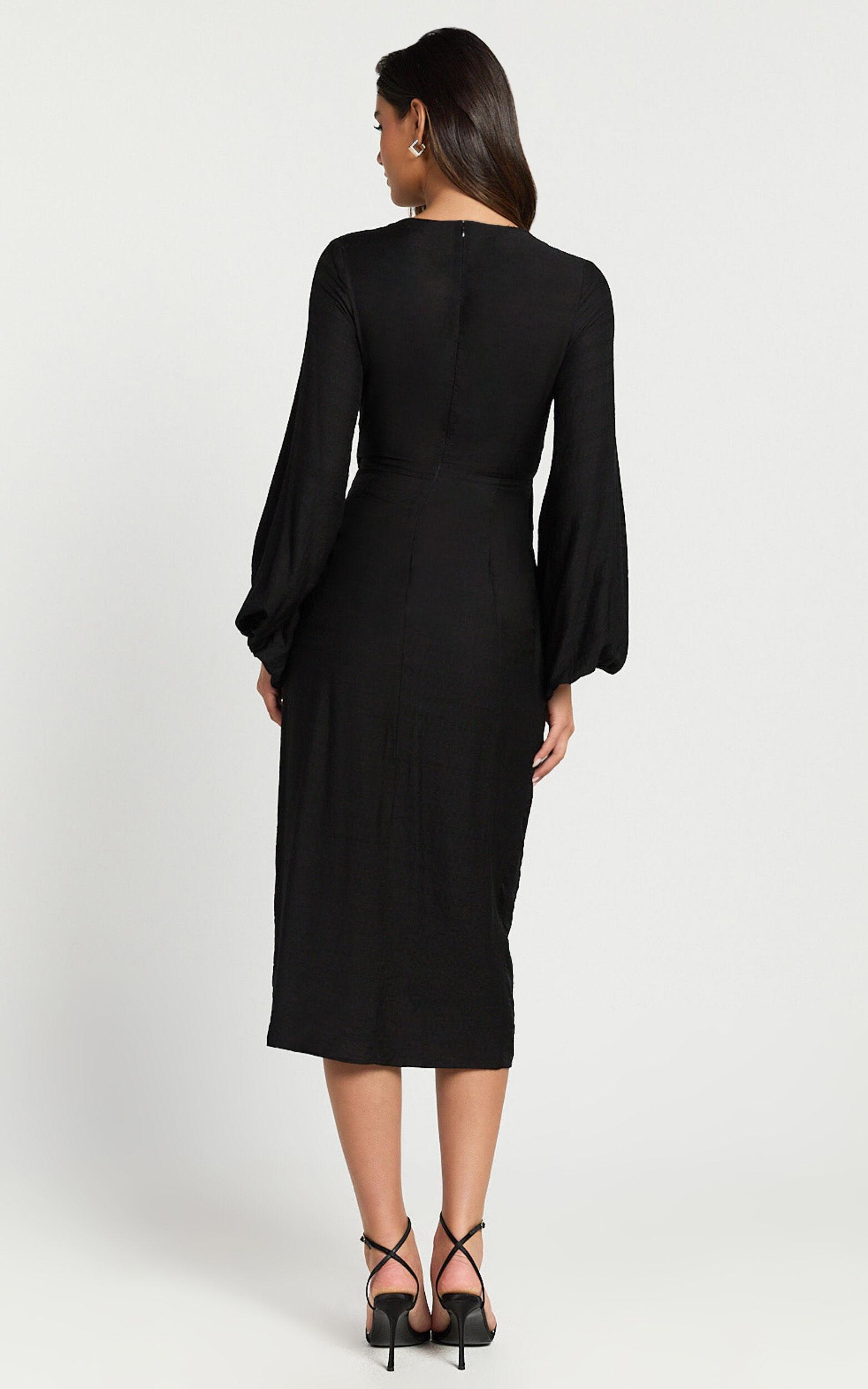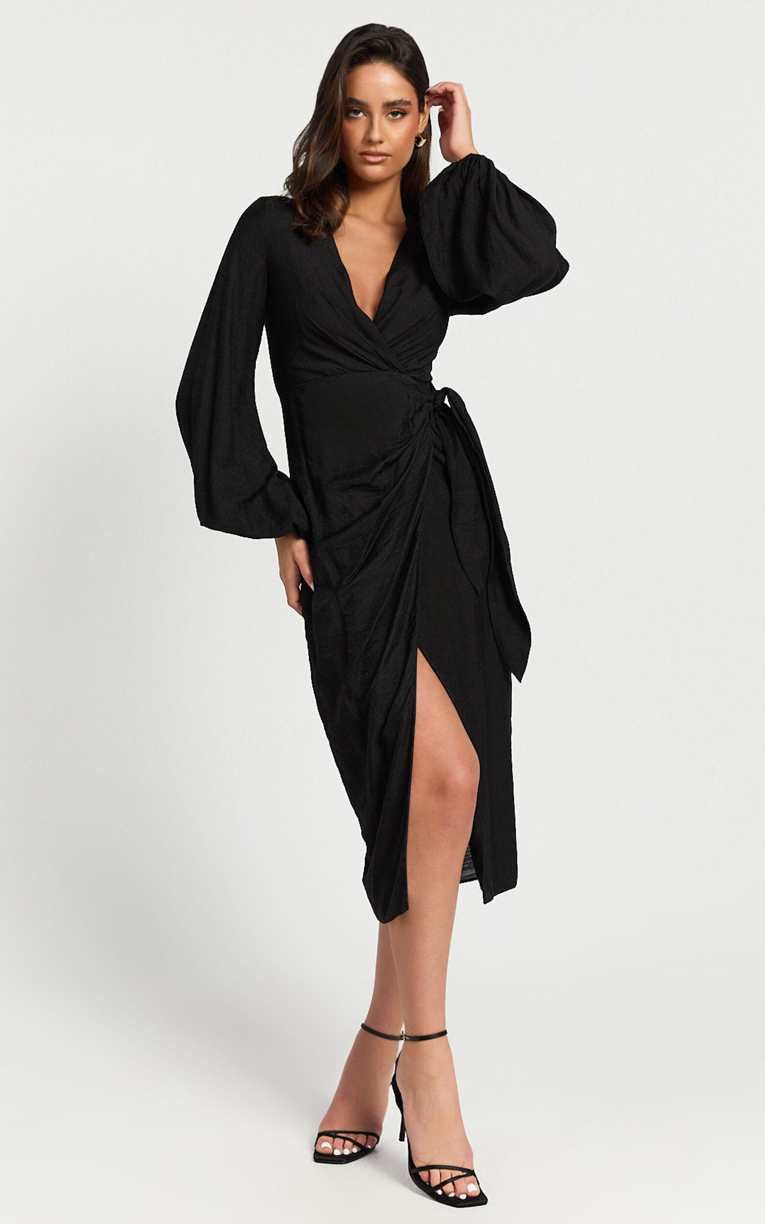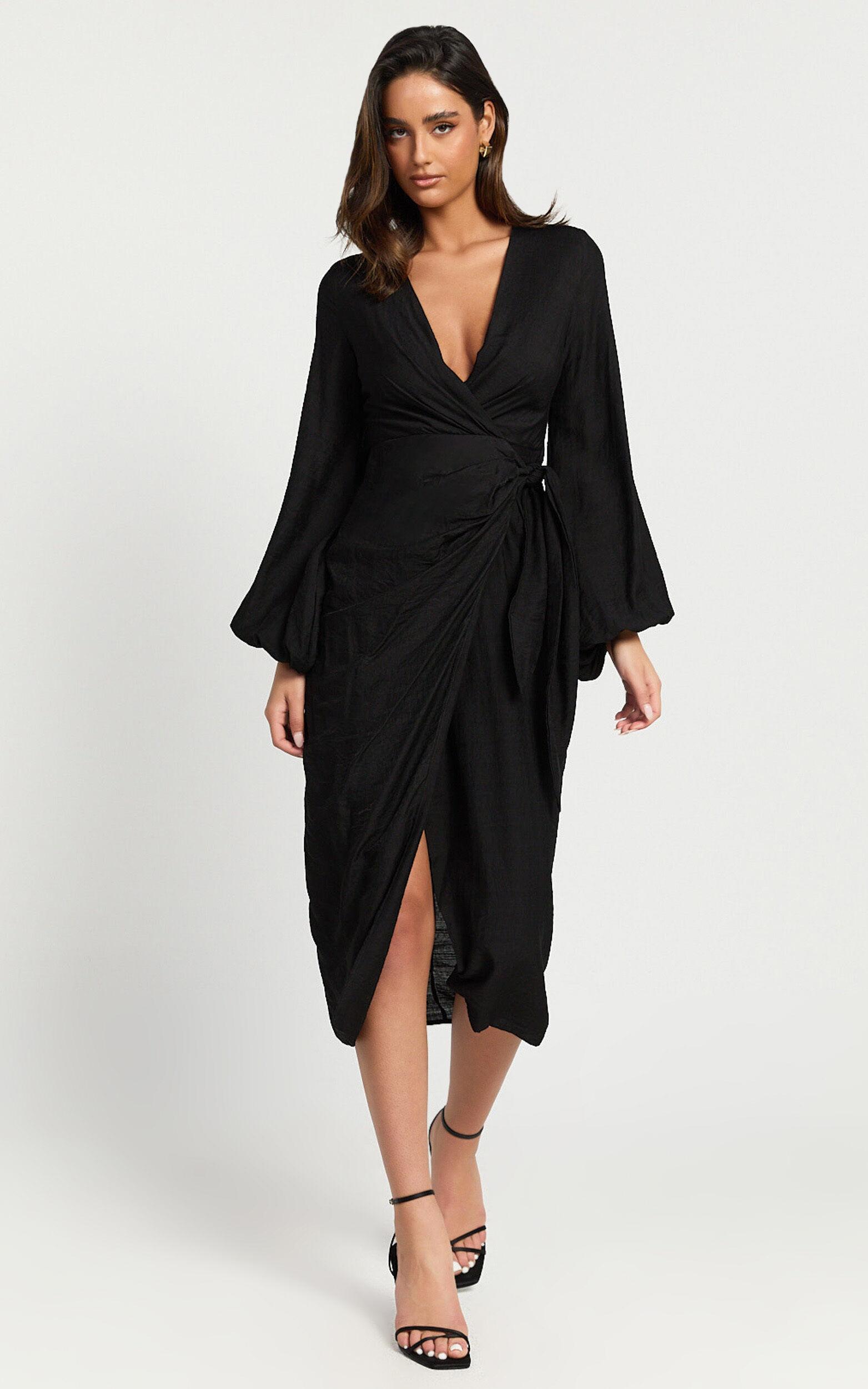 Elevate your style with our Taylor Midi Dress, a quintessential piece blending elegance with versatility. Crafted for the modern woman, this long sleeve wrap dress in classic black is a true wardrobe staple that transcends seasons. Made from lightweight woven rayon, it promises both comfort and effortless drape, making you feel as good as you look.Product Details:Wrap DressLight Weight WovenV NeckParty ReadyMidi LengthLong SleeveRayon MaterialSize and FitSize S / 8 length: 86cm / 33.86inMaterial and Care80% Rayon, 20% NylonLow / No stretch