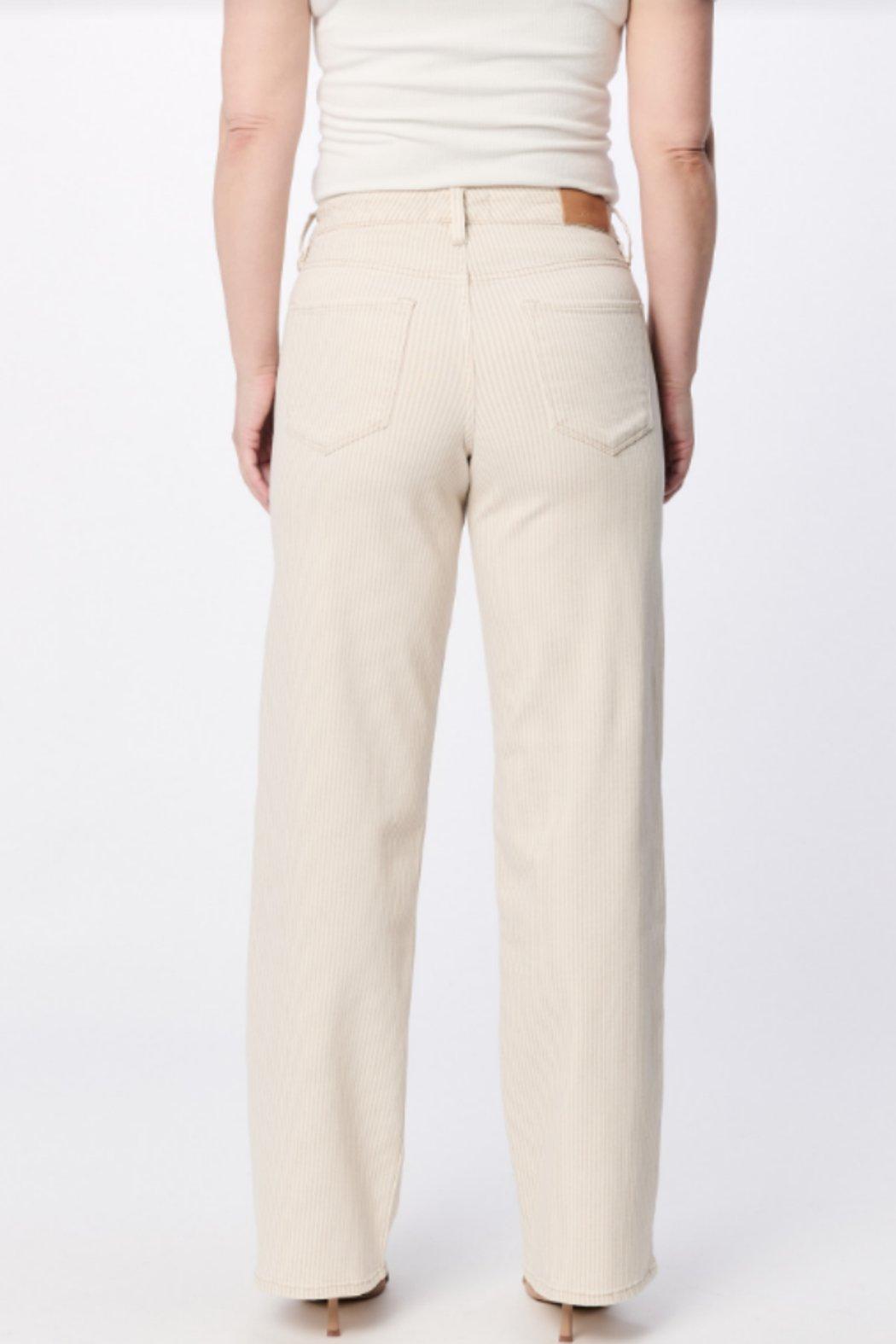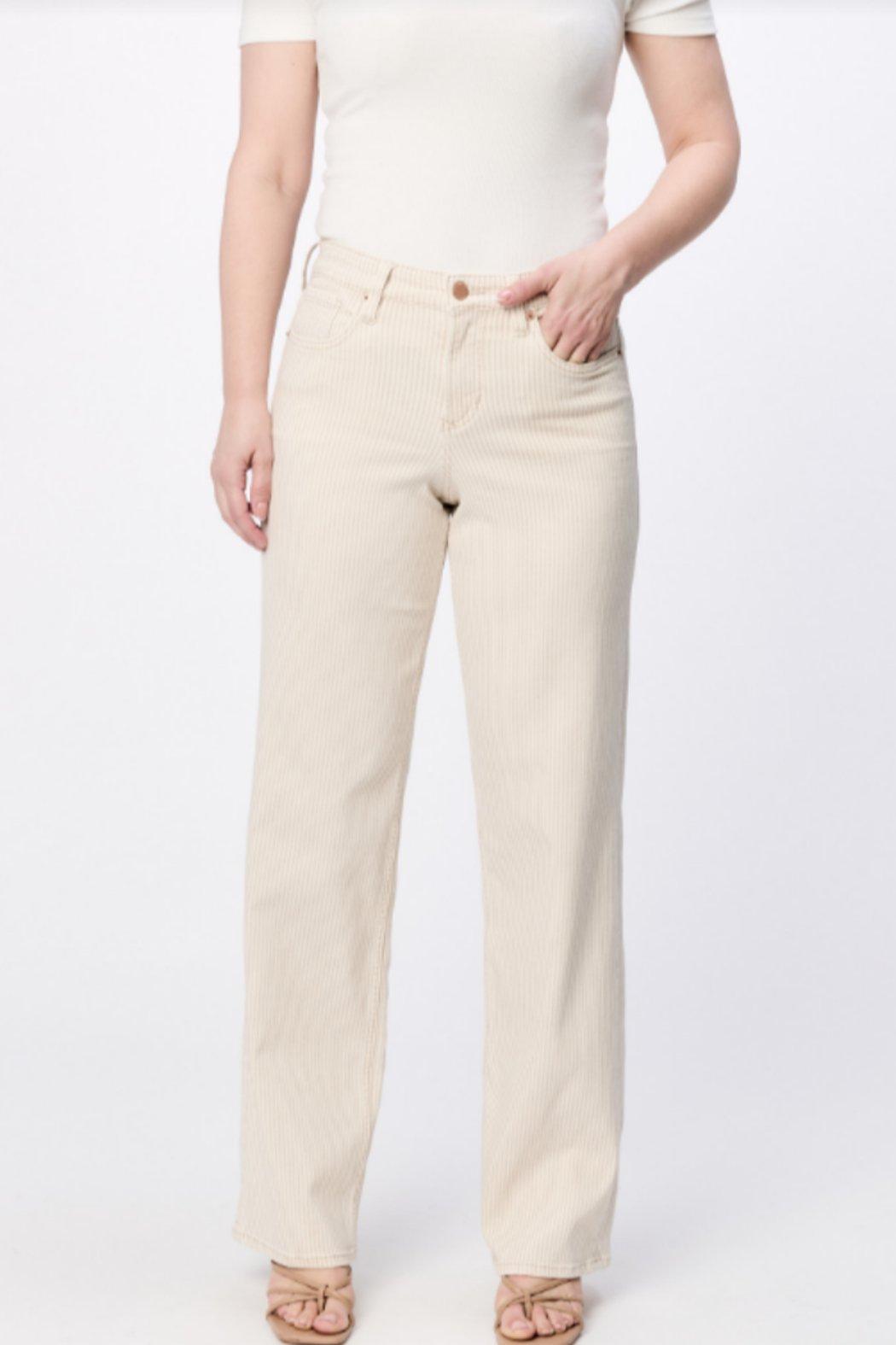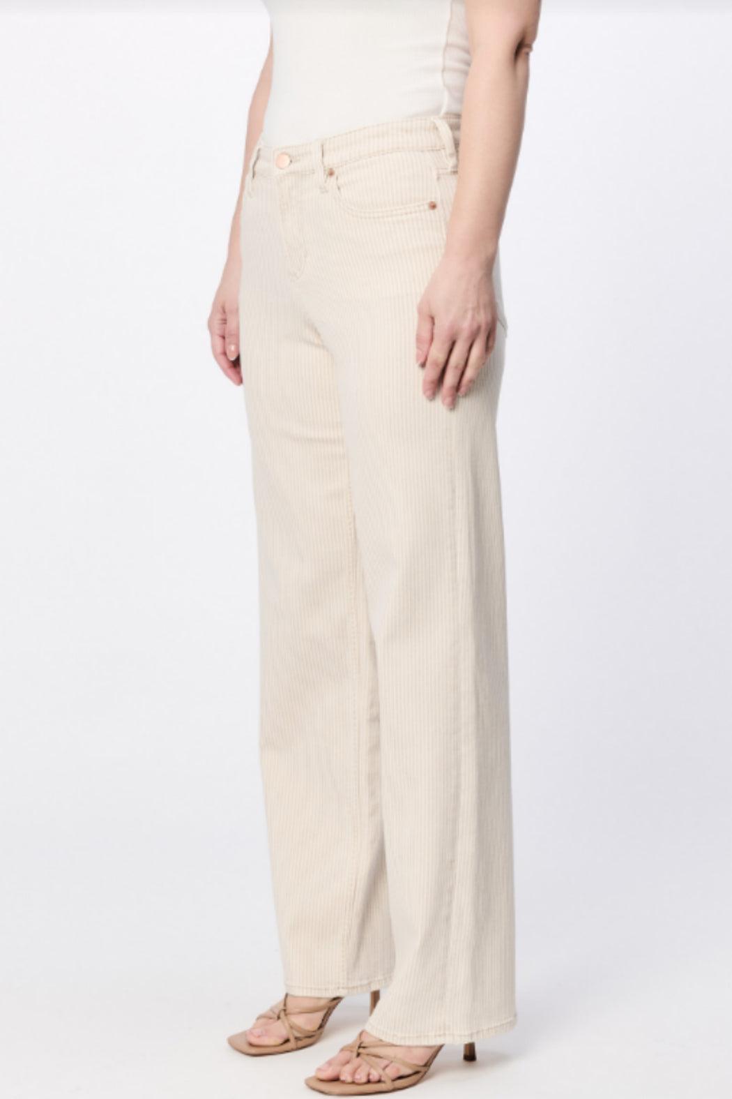 Step into effortless style with our Taylor Pant in Sand Stripe, featuring a flattering mid-high rise and a clean hemline for a polished silhouette.