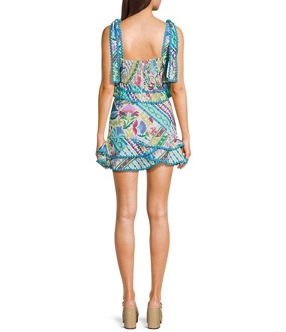 From TCEC, this 2-piece set features:Tank top:Patchwork printCropped tank topSquare necklineSleeveless Wide shoulder strapsRicrac trim throughoutZippered backApprox. 17.75" high point shoulder lengthSkirt:Matching patchwork print with ricrac trim throughoutAsymmetrical ruffled hemZippered backApprox. 15.25" lengthCare:Rayon/nylon; linedDry cleanImported.