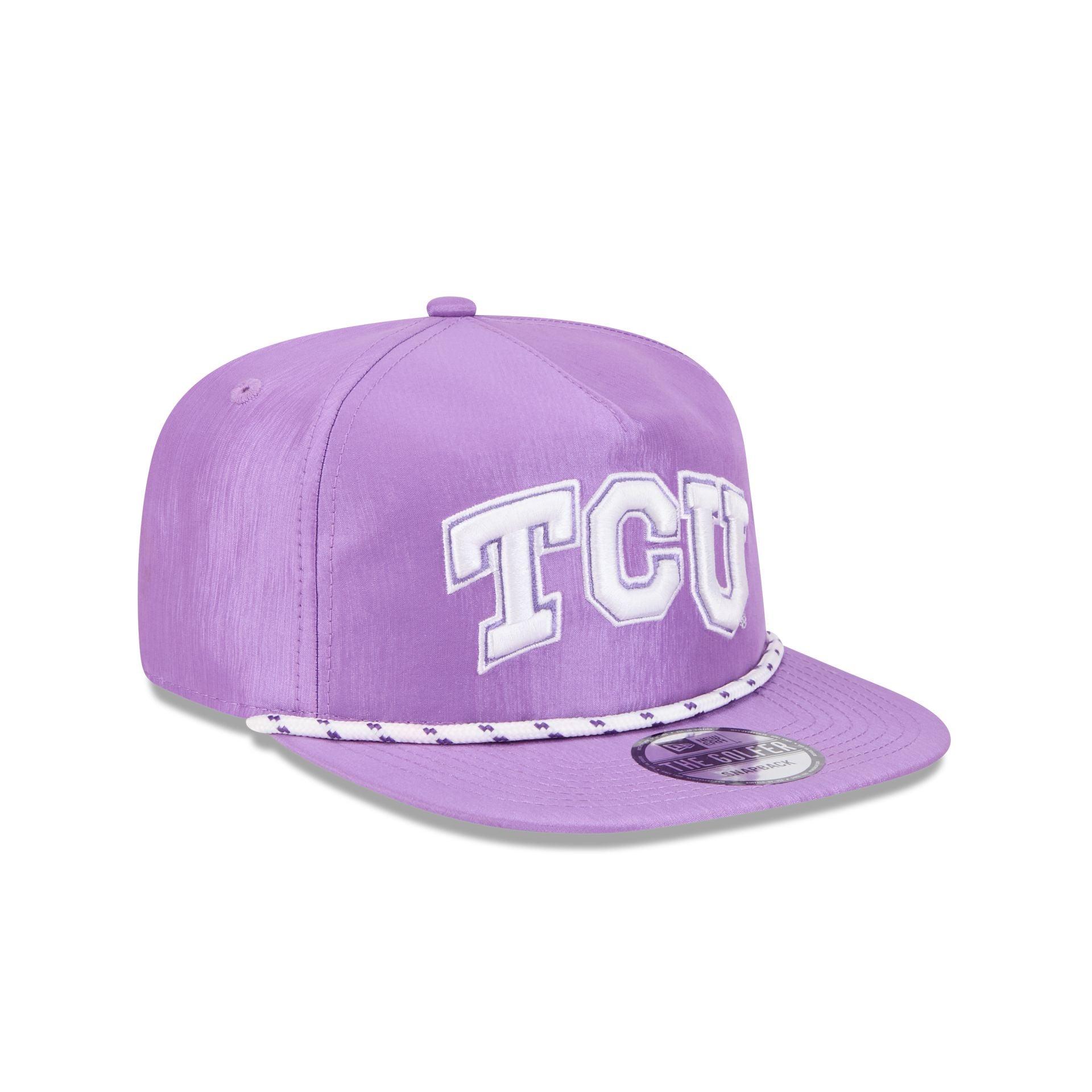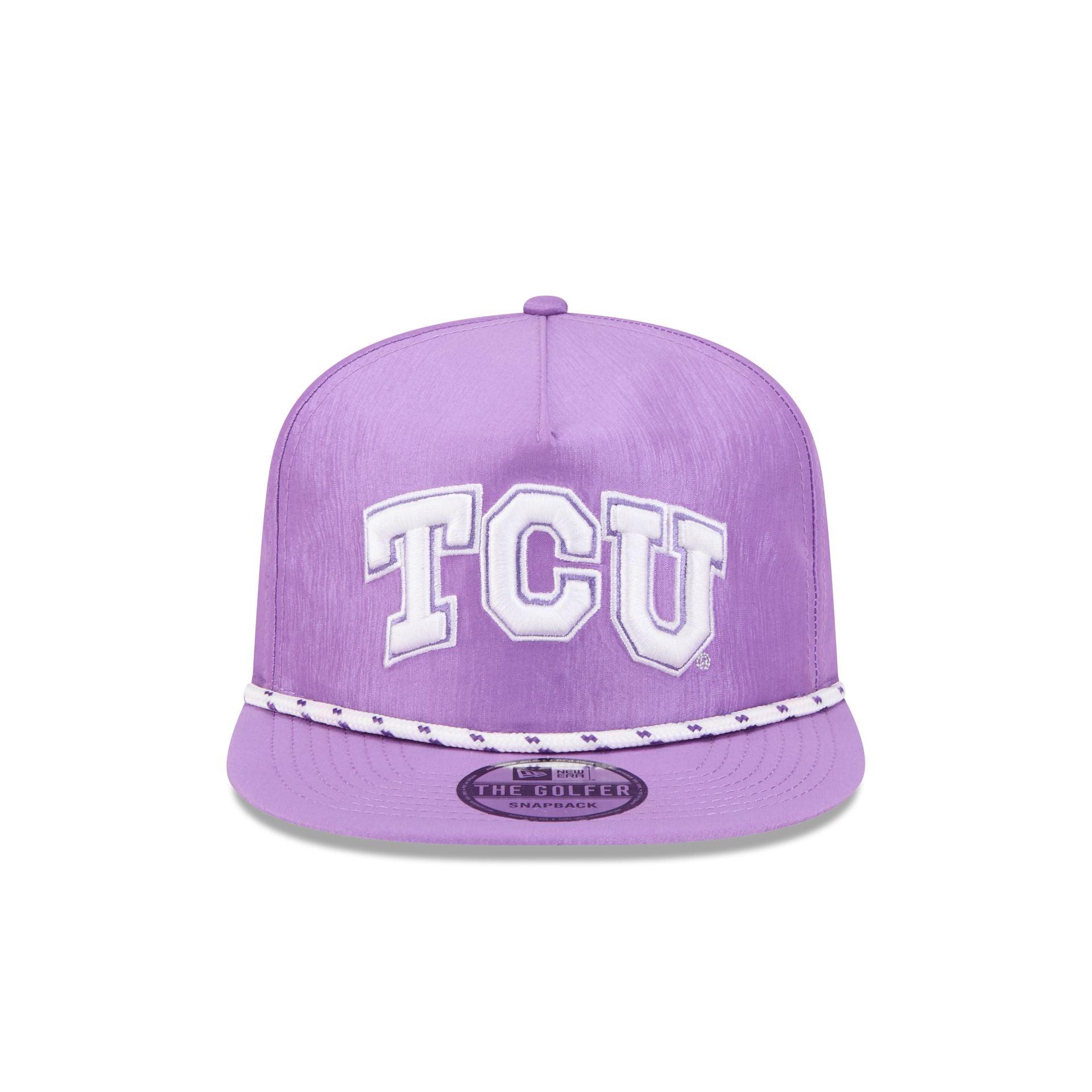 The TCU Horned Frogs Team Rope Golfer features an embroidered Horned Frogs logo at the front panels against a nylon fabrication throughout. Additional details include a white rope at the visor, a gray undervisor, and a snapback closure at the rear.