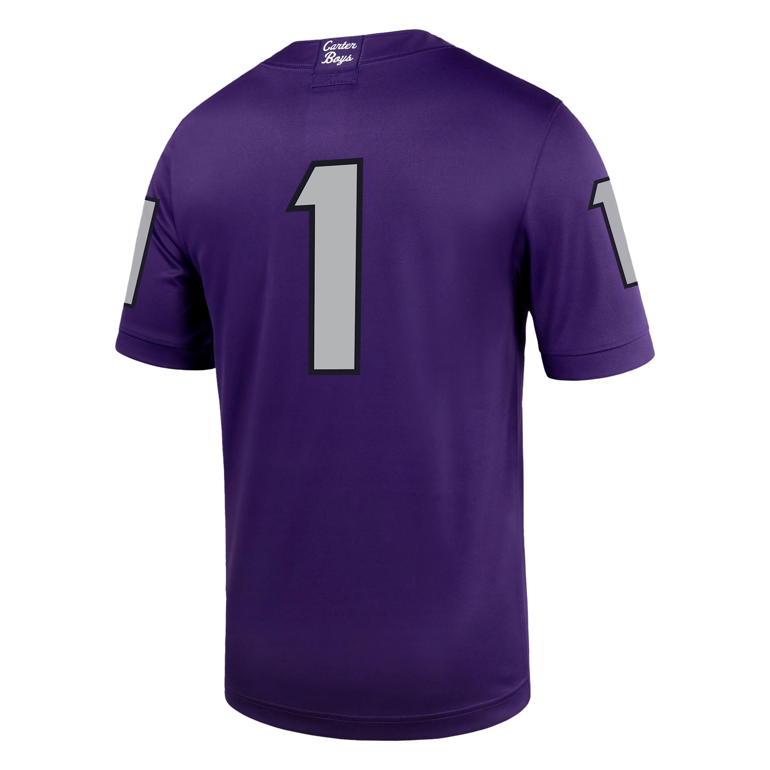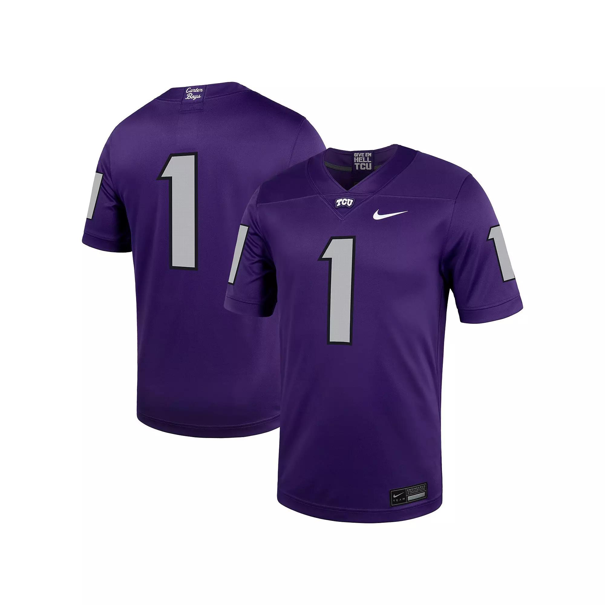Prepare to cheer on your TCU Horned Frogs with this sharp #1 Untouchable Football Jersey from Nike. This TCU Horned Frogs jersey boasts a loose fit, allowing for comfortable movement on and off the field. The combination of stitched fabric applique at the collar and a satin woven jock tag adds a touch of sophistication to this classic football jersey.Prepare to cheer on your TCU Horned Frogs with this sharp #1 Untouchable Football Jersey from Nike. This TCU Horned Frogs jersey boasts a loose fit, allowing for comfortable movement on and off the field. The combination of stitched fabric applique at the collar and a satin woven jock tag adds a touch of sophistication to this classic football jersey.PRODUCT FEATURESMachine wash, tumble dry lowSatin woven jock tagOfficially licensedBrand: NikeNike GameMaterial: 100% PolyesterStitched fabric applique at collarHeat-sealed graphicsShort sleeveImportedLoose fit Color: Purple. Gender: male. Age Group: adult. Material: Cotton.